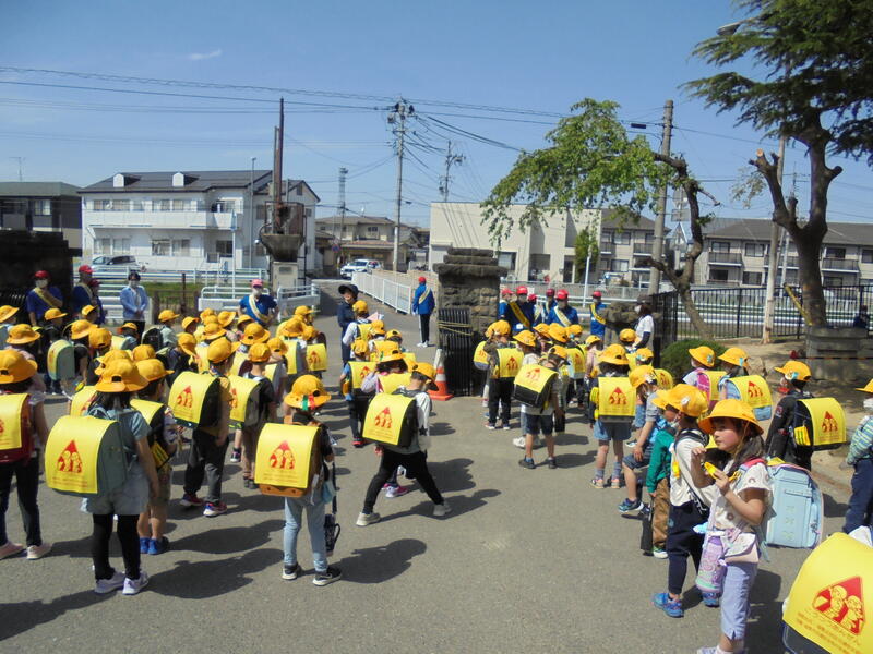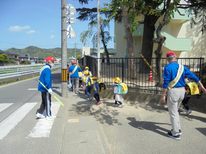 1年生の下校時、サポート会の皆さんが見守ってくれています。