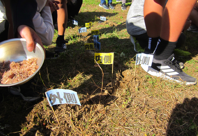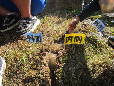 流れの内側と外側におがくずを置いて、流れの速さの違いを調べました。