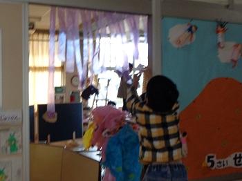 そして、きりん組のお部屋はお化け屋敷に変身。りす組のみんなをご招待。かわいいお化けさんたち、怖かったかなぁ?