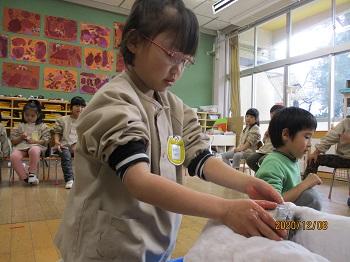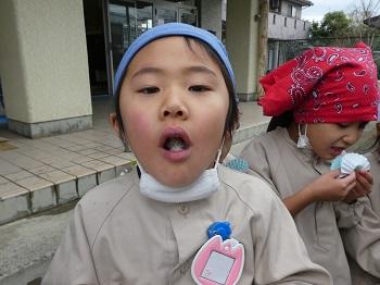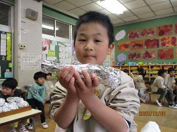 今週、水曜日に焼き芋を食べました。前の日に、きりん組のみんながお芋を濡れ新聞とアルミホイルにくるんでくれました。
