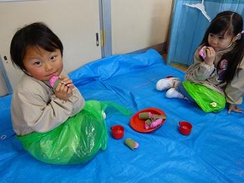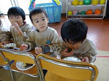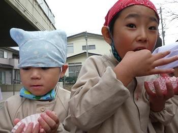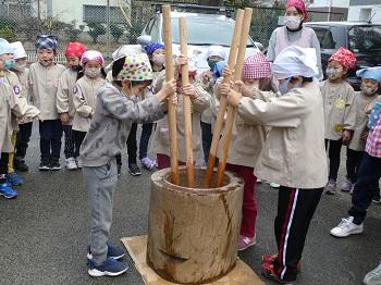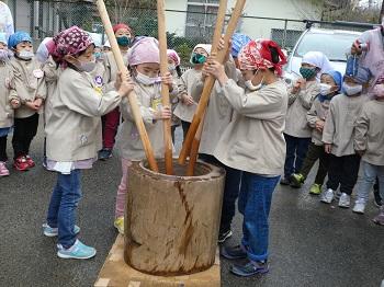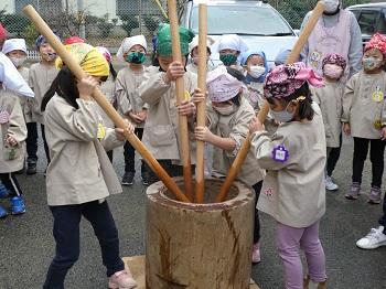木曜日には、お楽しみのもちつき会。子どもたちが千本杵でついた後、大人たちも代わりばんこにつきました。それを見ていた子どもたち、大人の真似して、ぺったん、ぺったん。できたお餅は、きな粉餅とつゆ餅に。ビヨーンと伸びて、とっても美味しく、何度もおかわり。