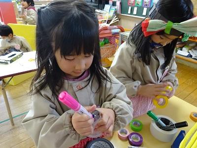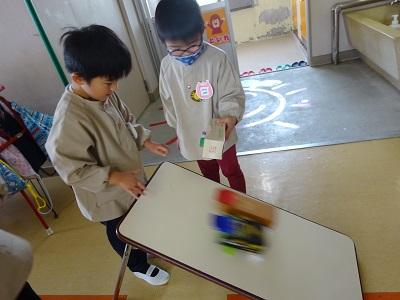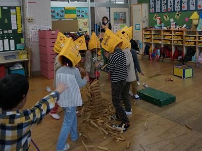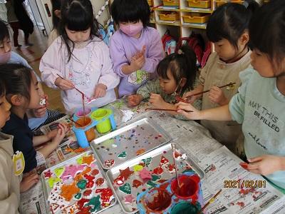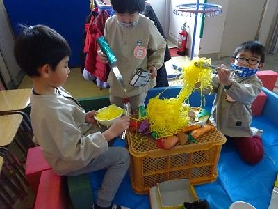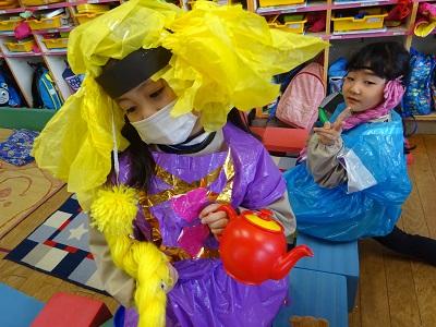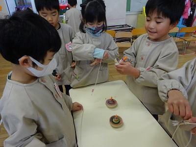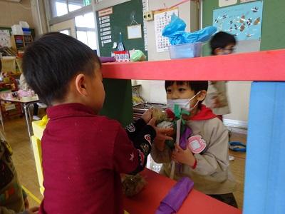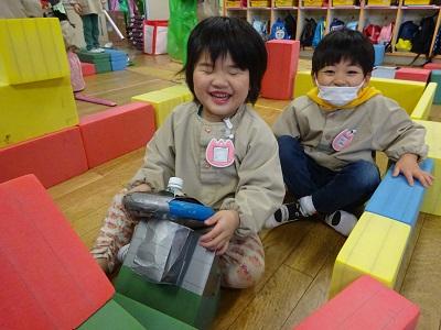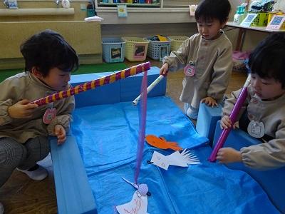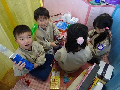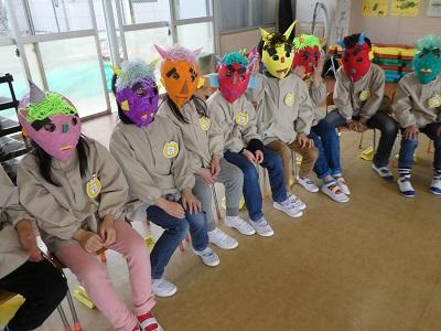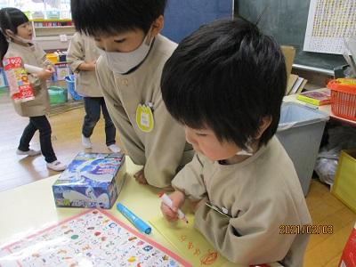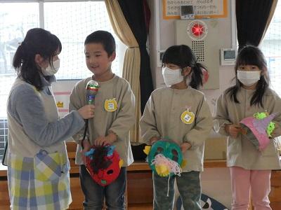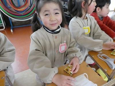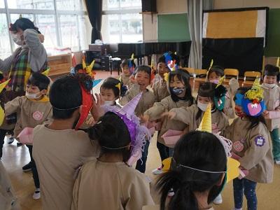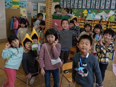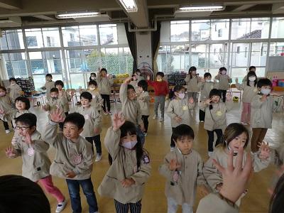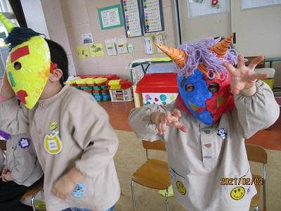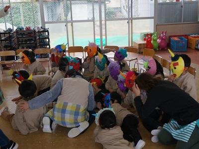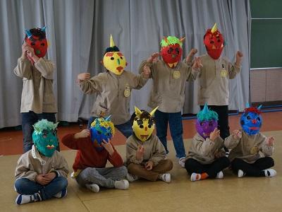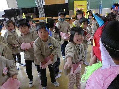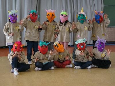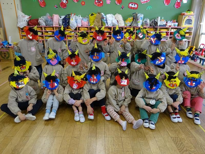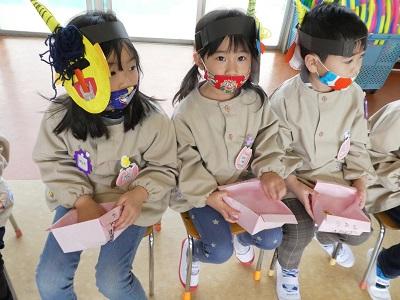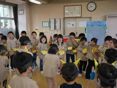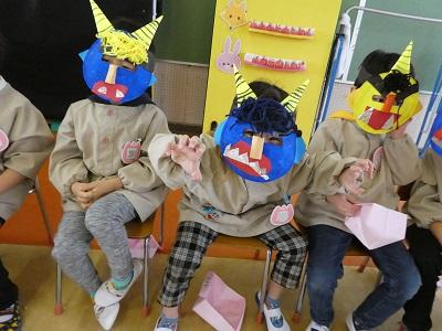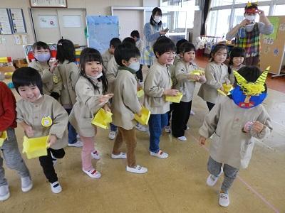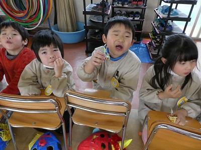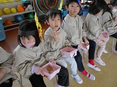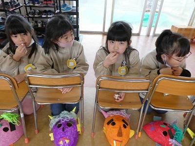 さて、火曜日は「節分の集い」でした。節分の話、ダンス、追い出したい鬼の発表の後は、いよいよ豆まきです。りす組、きりん組交互に鬼を追い払い、最後はお豆を食べて終了です。ただ訳あって、食べたのは"たまごボーロ"でしたが、「懐かしー」とか言いながら食べてました。