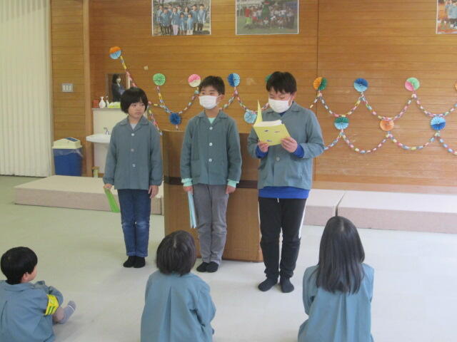 始業式では、代表児童が冬休みの思い出と3学期にがんばりたいことを発表しました。家族と楽しく充実した冬休みを過ごしたことや、3学期の活動への前向きな思いが伝わってきました。