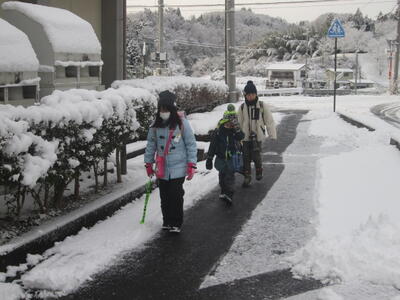 第2学期最終日の朝は雪の朝となりました。学校周辺の歩道は技能主査さんが除雪をしてくださり、子どもたちは見守っていただきながら安全に登校しました。