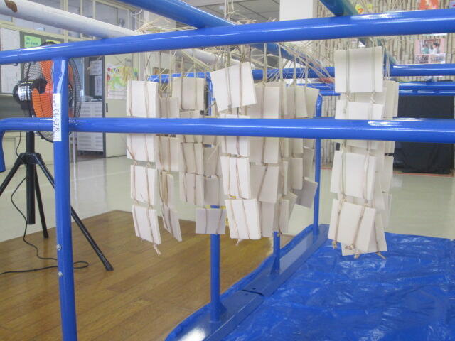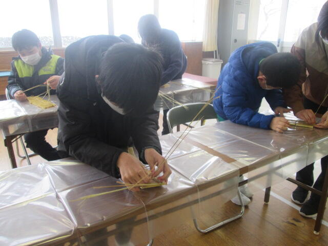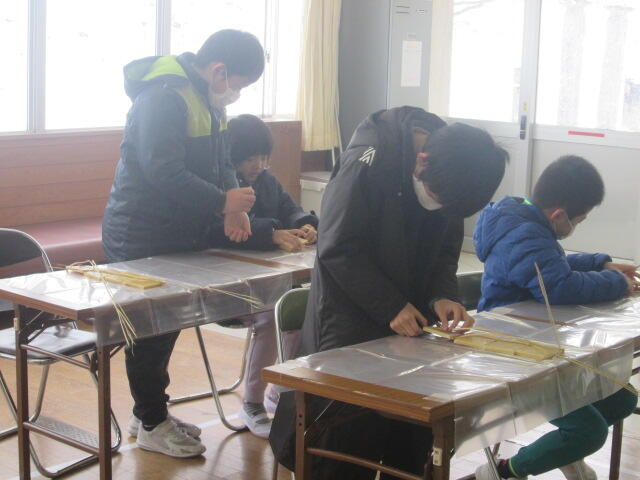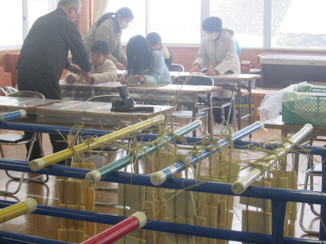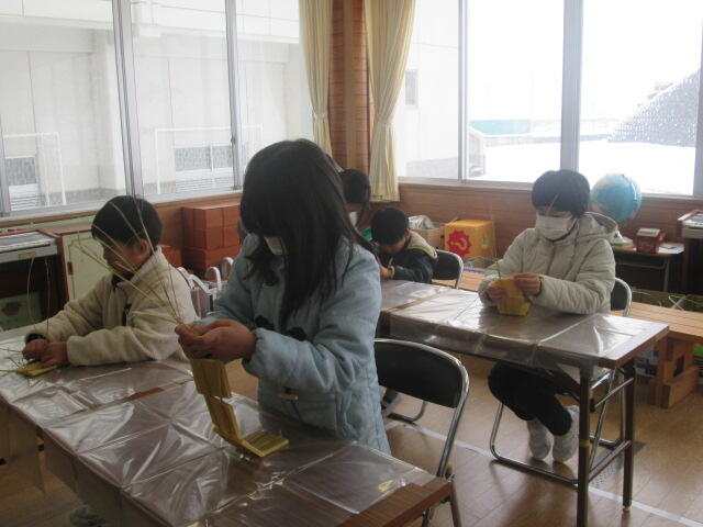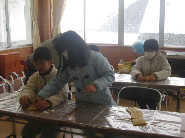 冬といえば、立子山地区特産の凍み豆腐。先日、工場見学の折に凍み豆腐編みを教えていただき、体験した子どもたちですが、今日は自分たちで1枚1枚の凍った豆腐をわらで編む作業に挑戦しました。上級生が下級生に教えてあげたり、友達同士で協力したりしながら、編んでいきました。編み終えたものは、ホールの一角の乾燥コーナーへ。おいしい凍み豆腐になるといいですね。