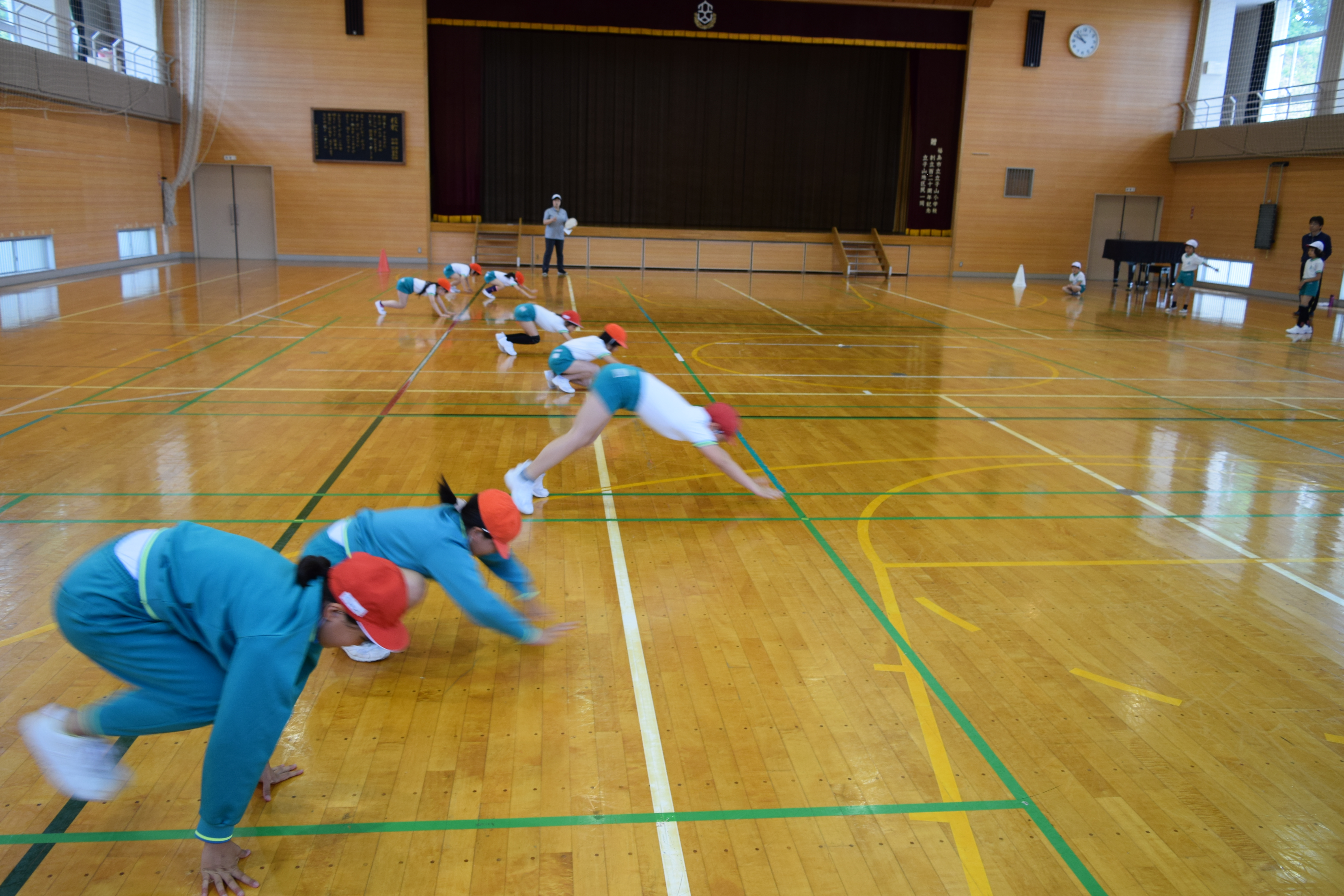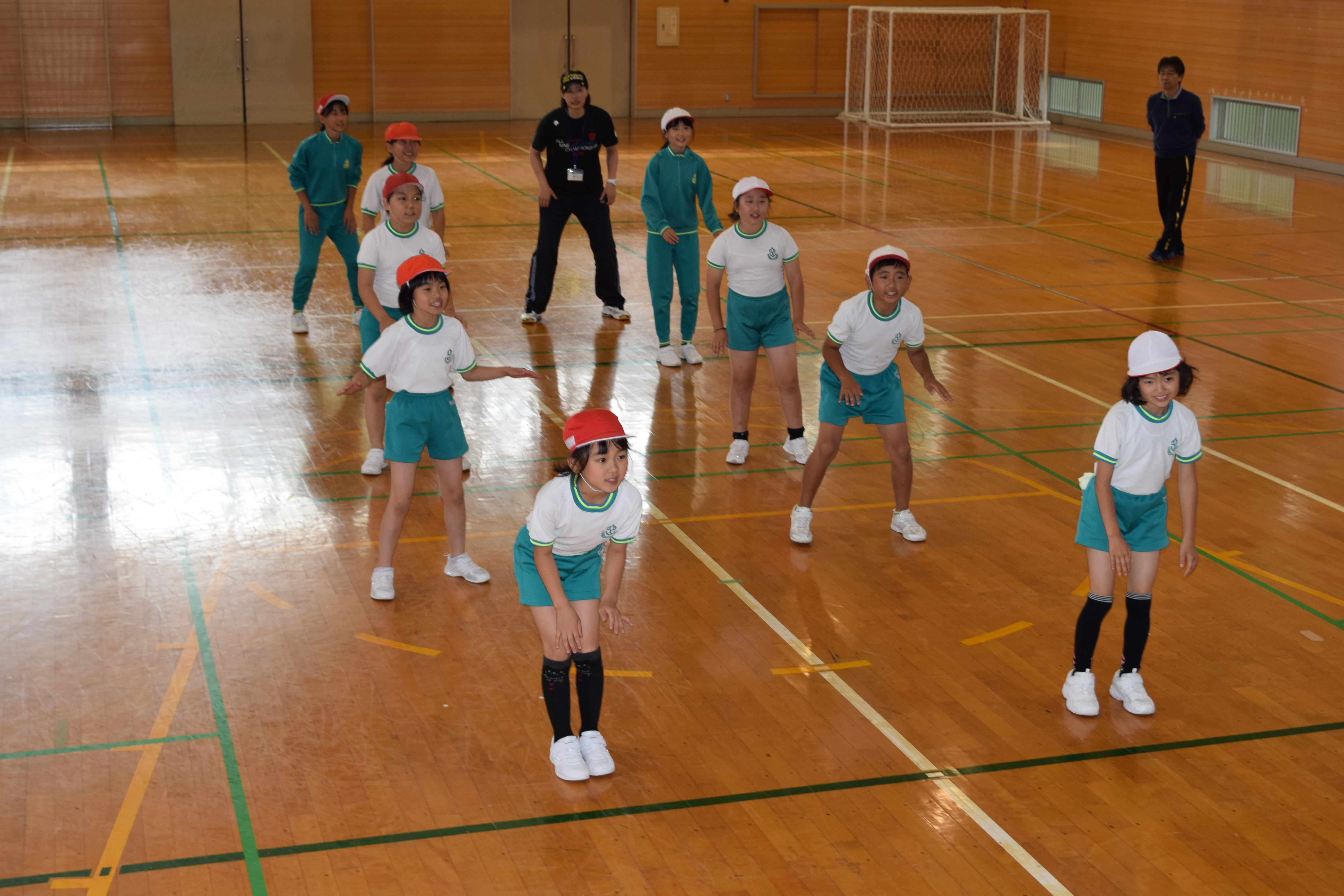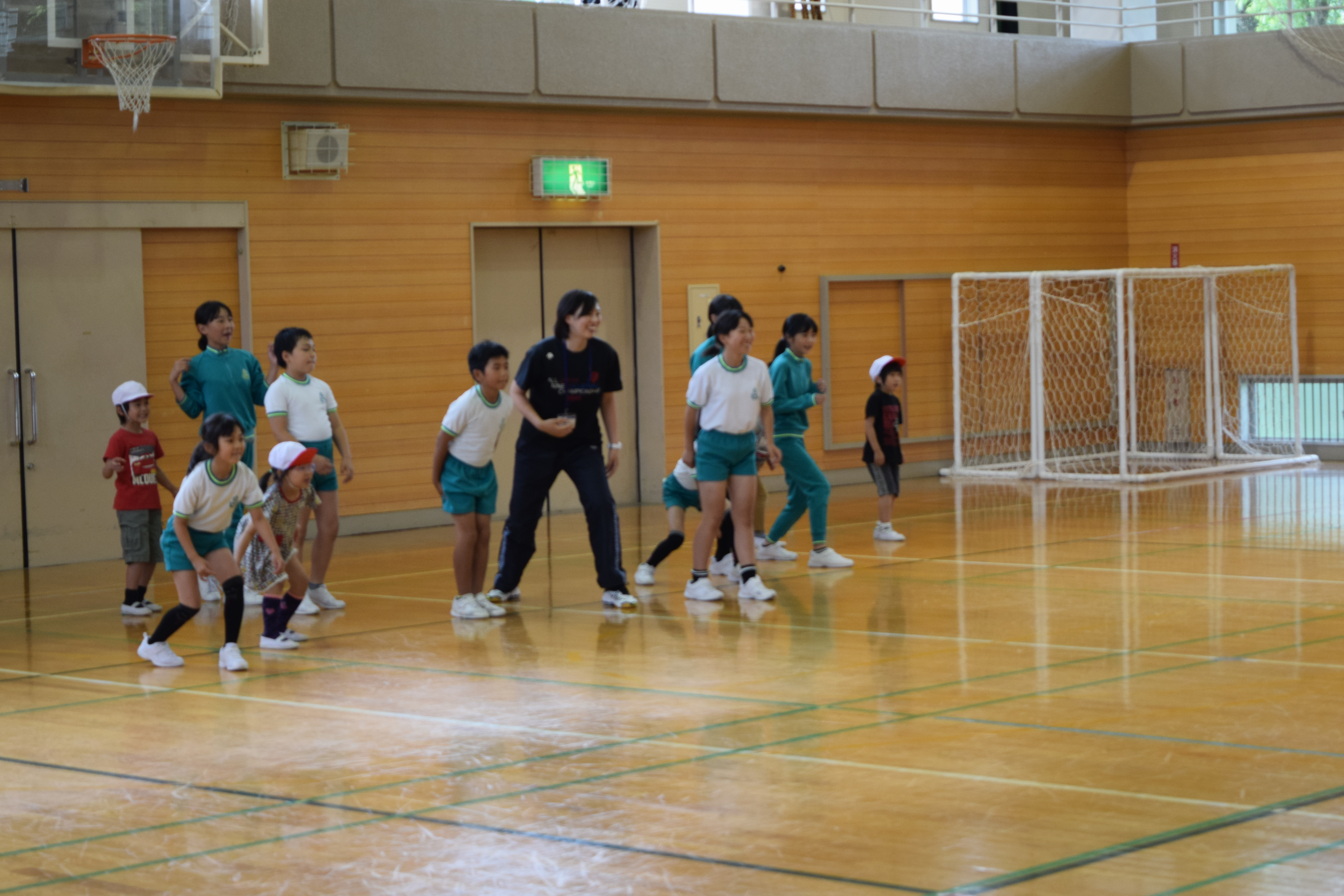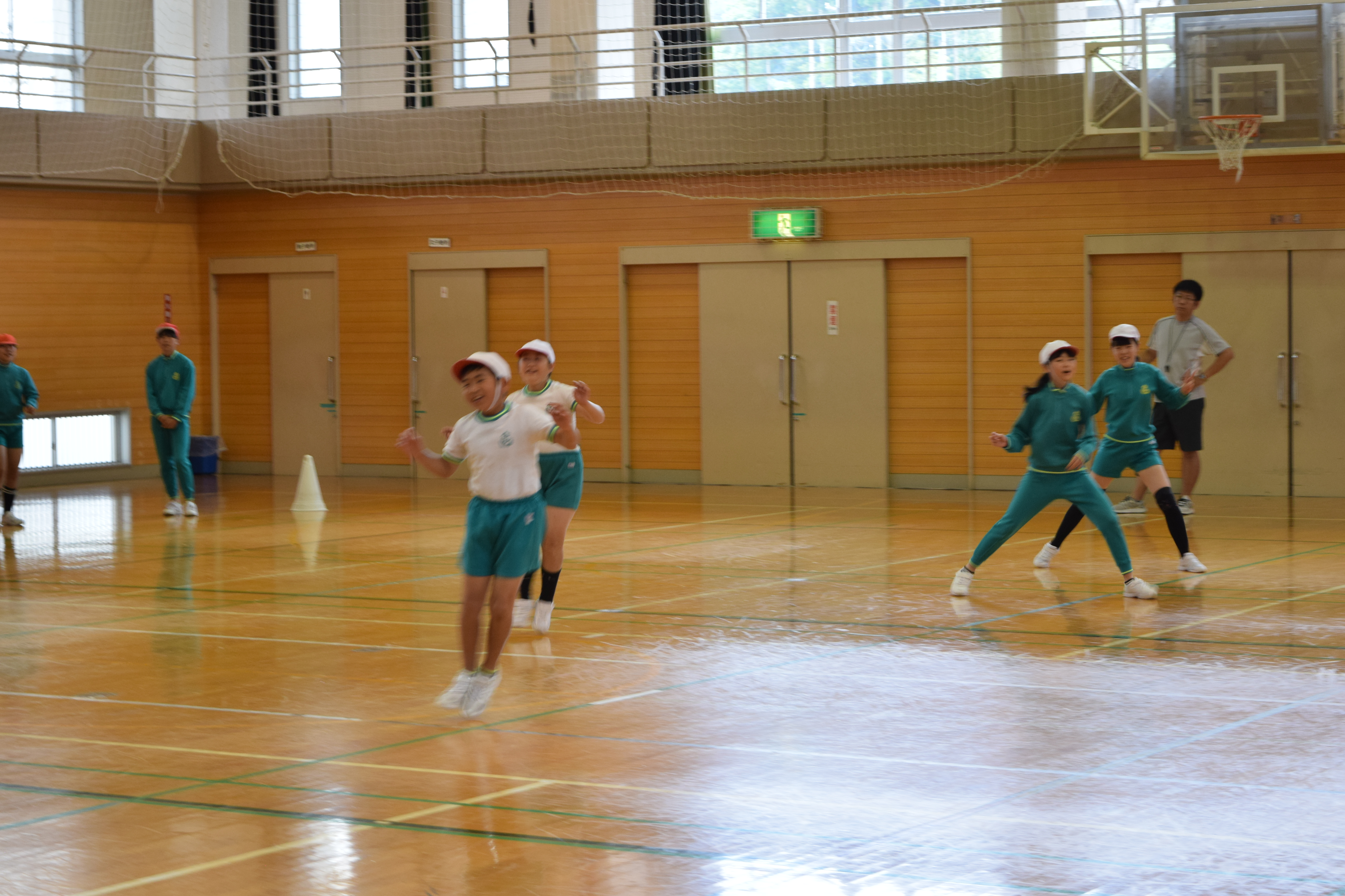 2018年6月18日 16時22分午前中に引き続き、午後は昼休みの全校遊びでボールを使った「だるまさんが転んだ」を教えていただきました。初めてのルールでしたが、みんなすぐに覚え、楽しく活動していました。5校時は、5・6年生の高跳びの授業を一緒に行いました。助走のリズムや足の上げ方などに注意して活動していました。放課後は、3から6年生が、ゲームを通して体づくりに取り組みました。今日1日、新しいゲームや運動のポイントについて教えていただき、全員が楽しみながら、心地よい汗を流していました。