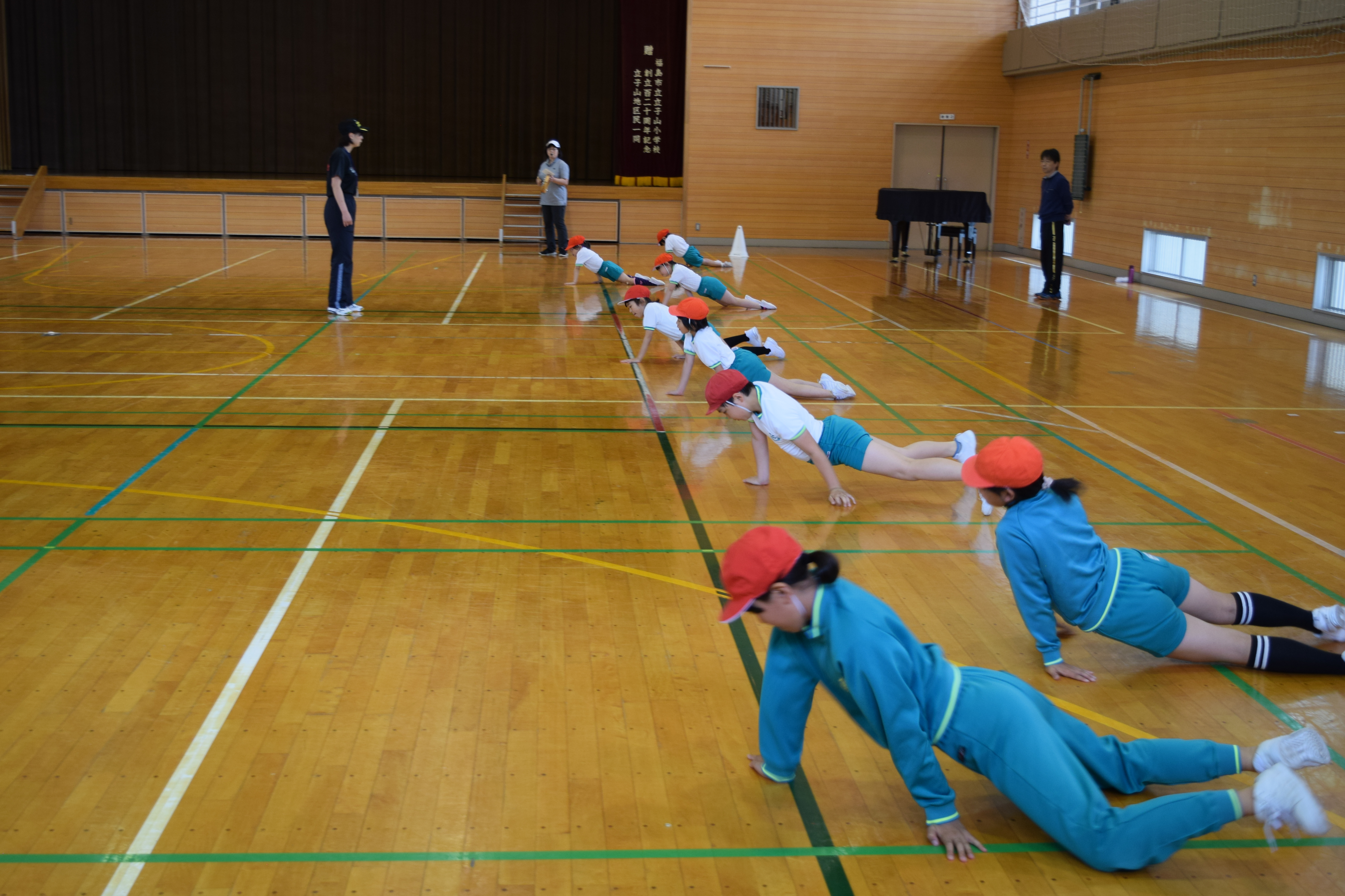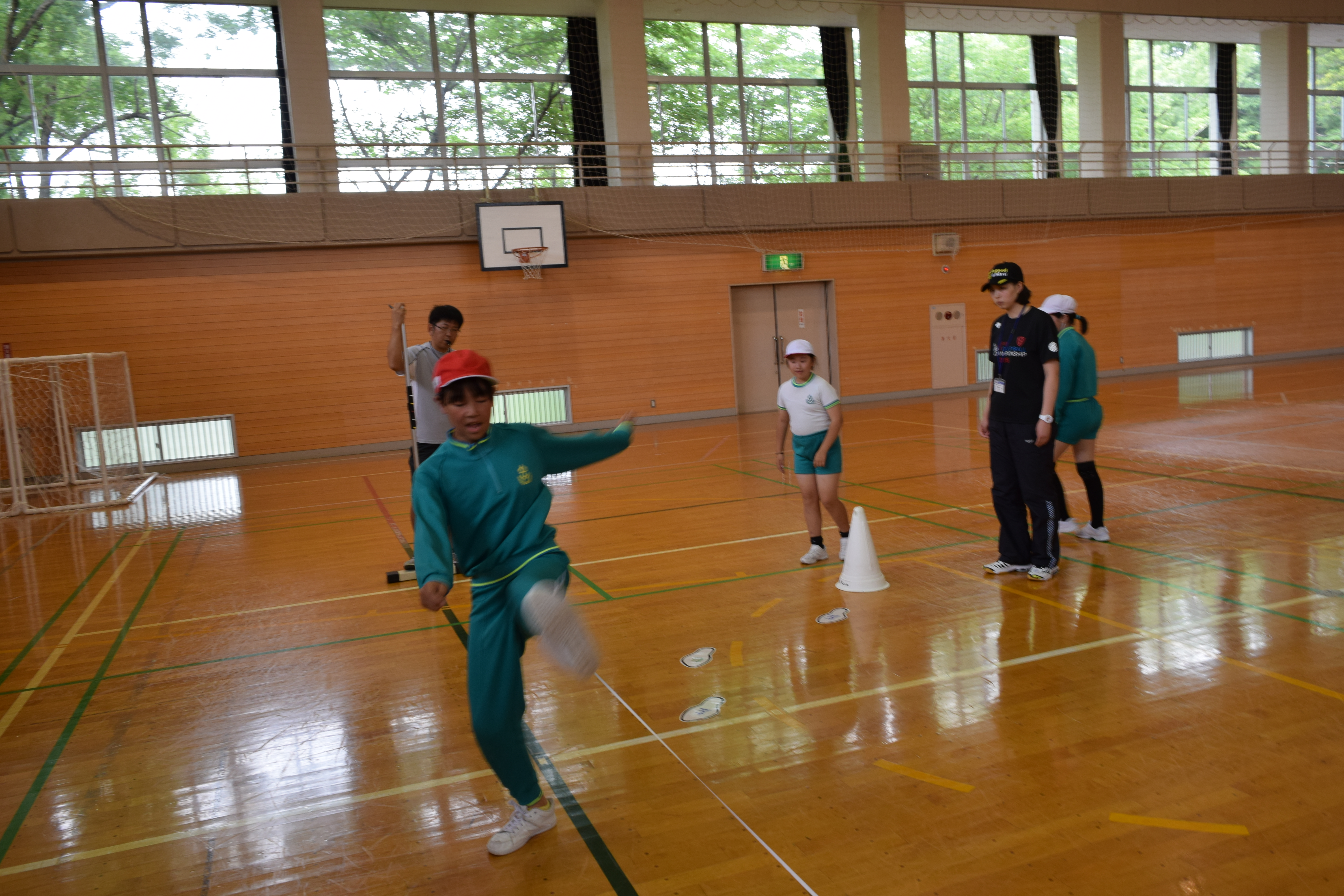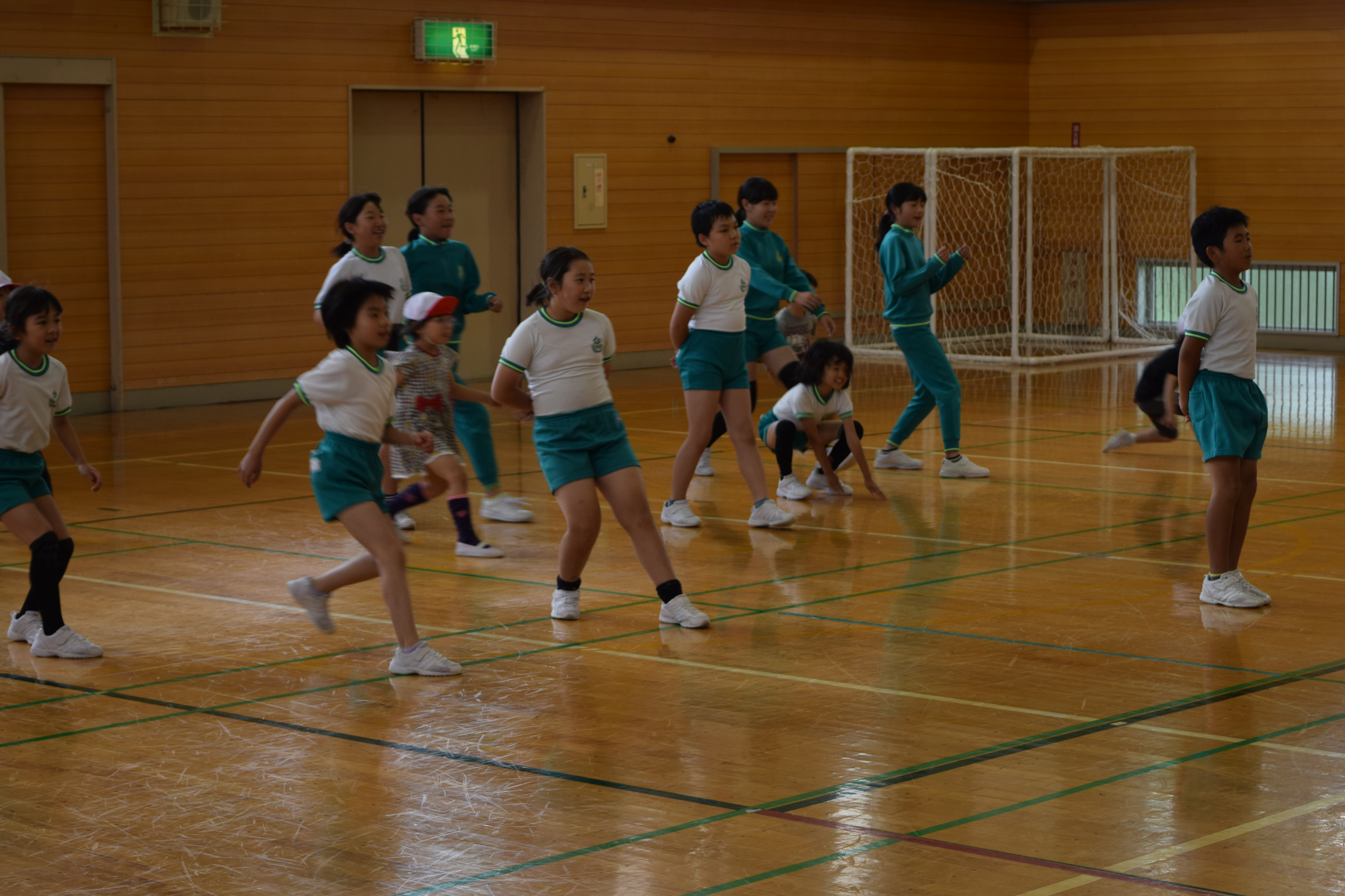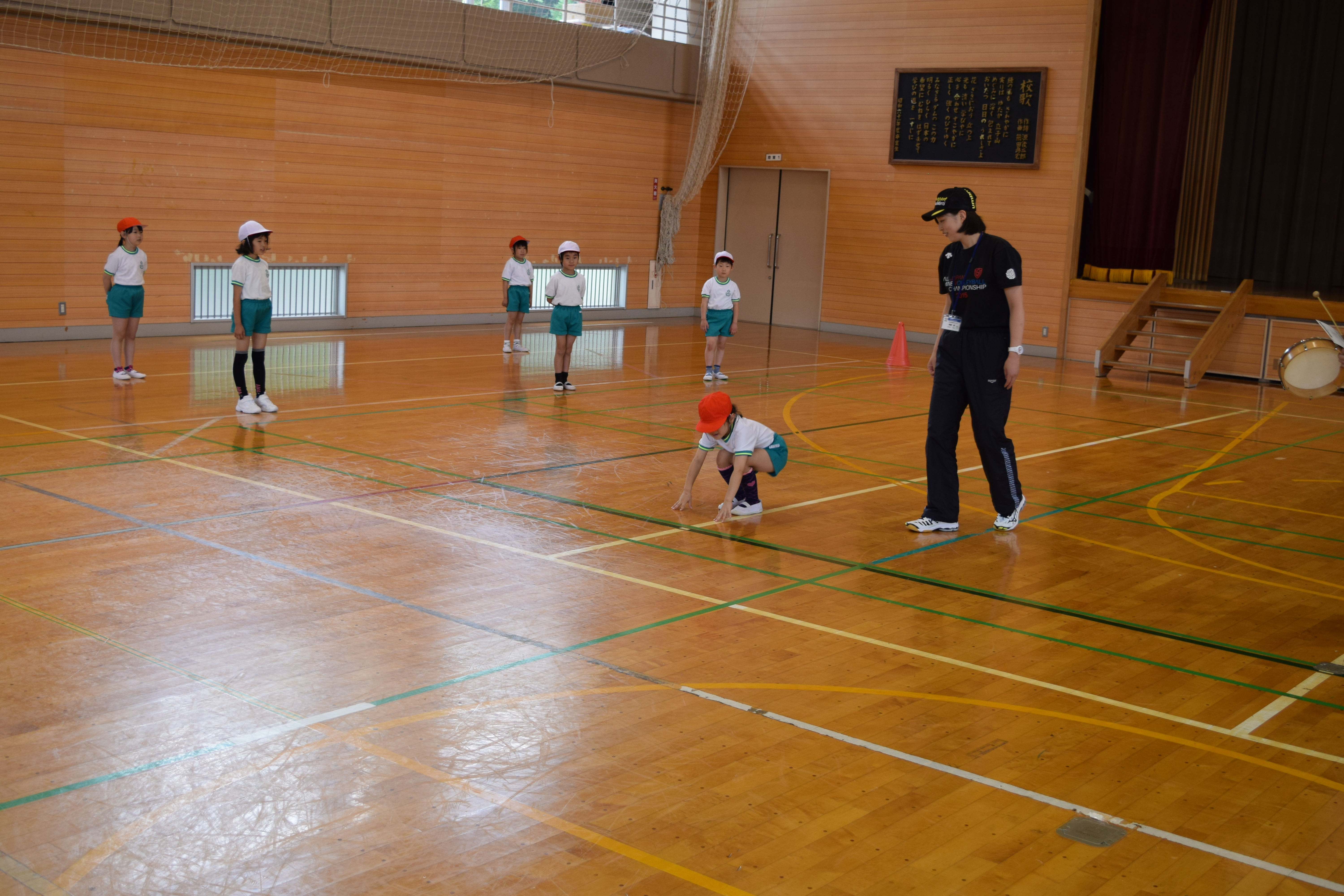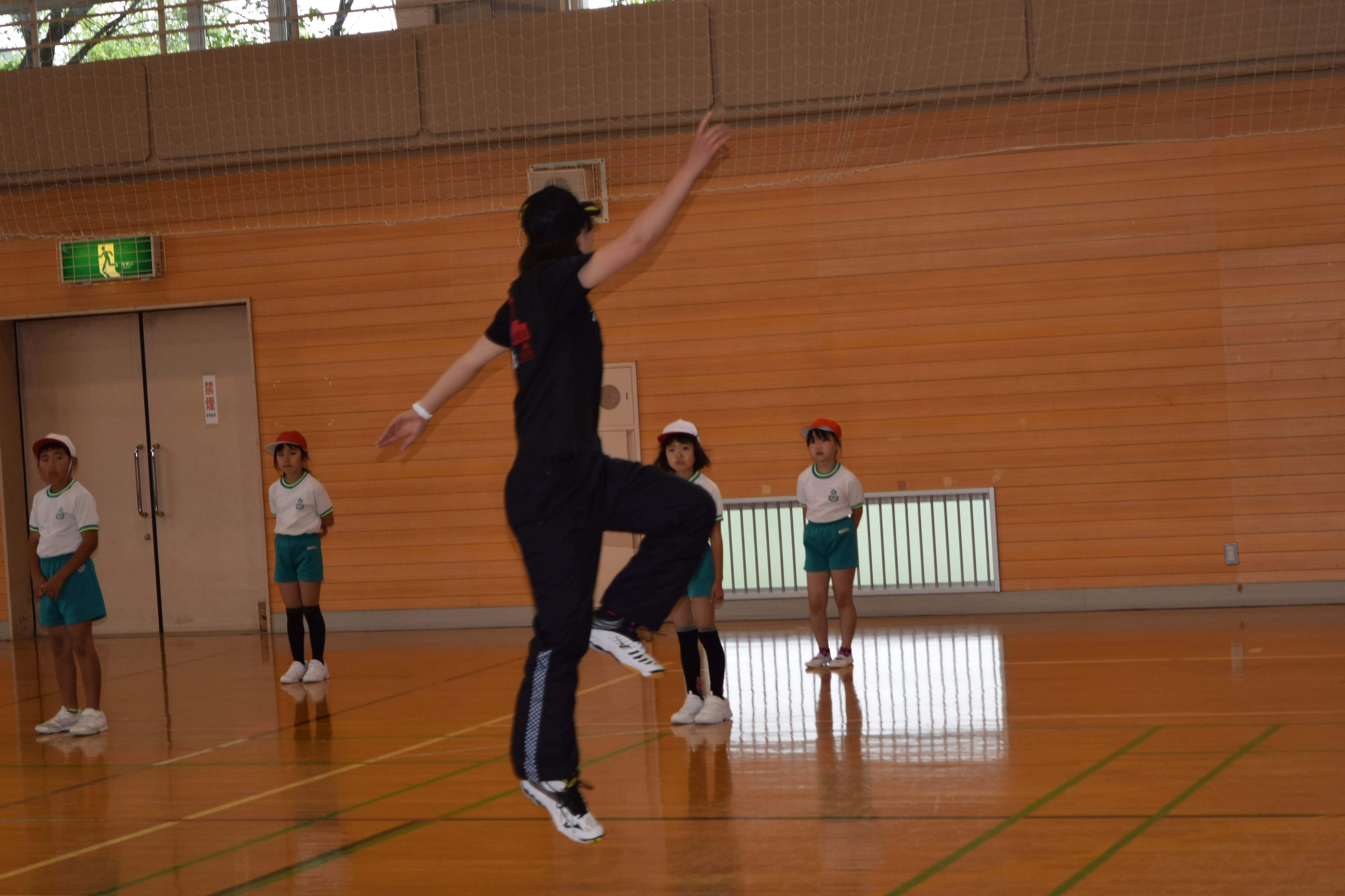 2018年6月18日 16時22分午前中に引き続き、午後は昼休みの全校遊びでボールを使った「だるまさんが転んだ」を教えていただきました。初めてのルールでしたが、みんなすぐに覚え、楽しく活動していました。5校時は、5・6年生の高跳びの授業を一緒に行いました。助走のリズムや足の上げ方などに注意して活動していました。放課後は、3から6年生が、ゲームを通して体づくりに取り組みました。今日1日、新しいゲームや運動のポイントについて教えていただき、全員が楽しみながら、心地よい汗を流していました。