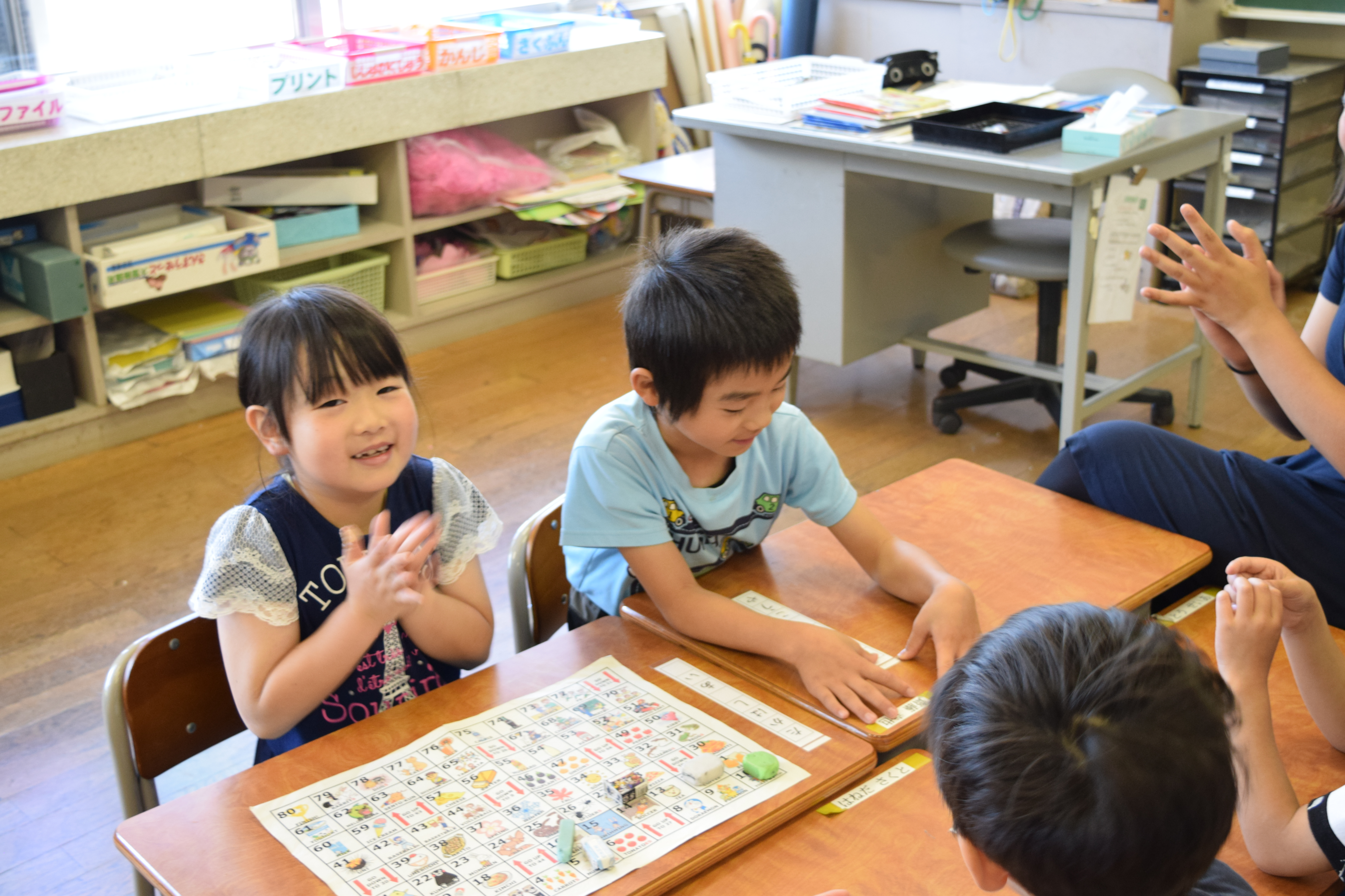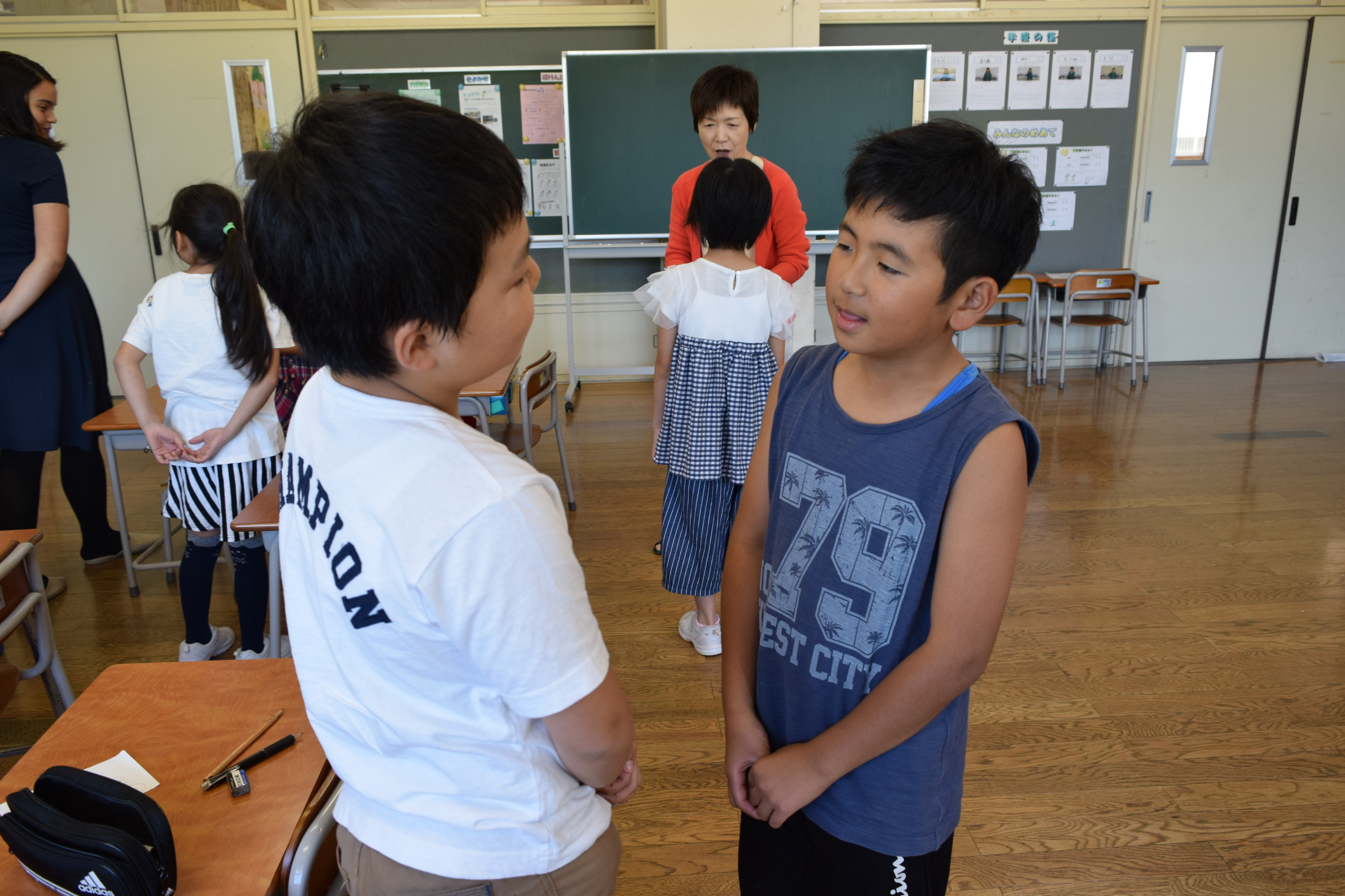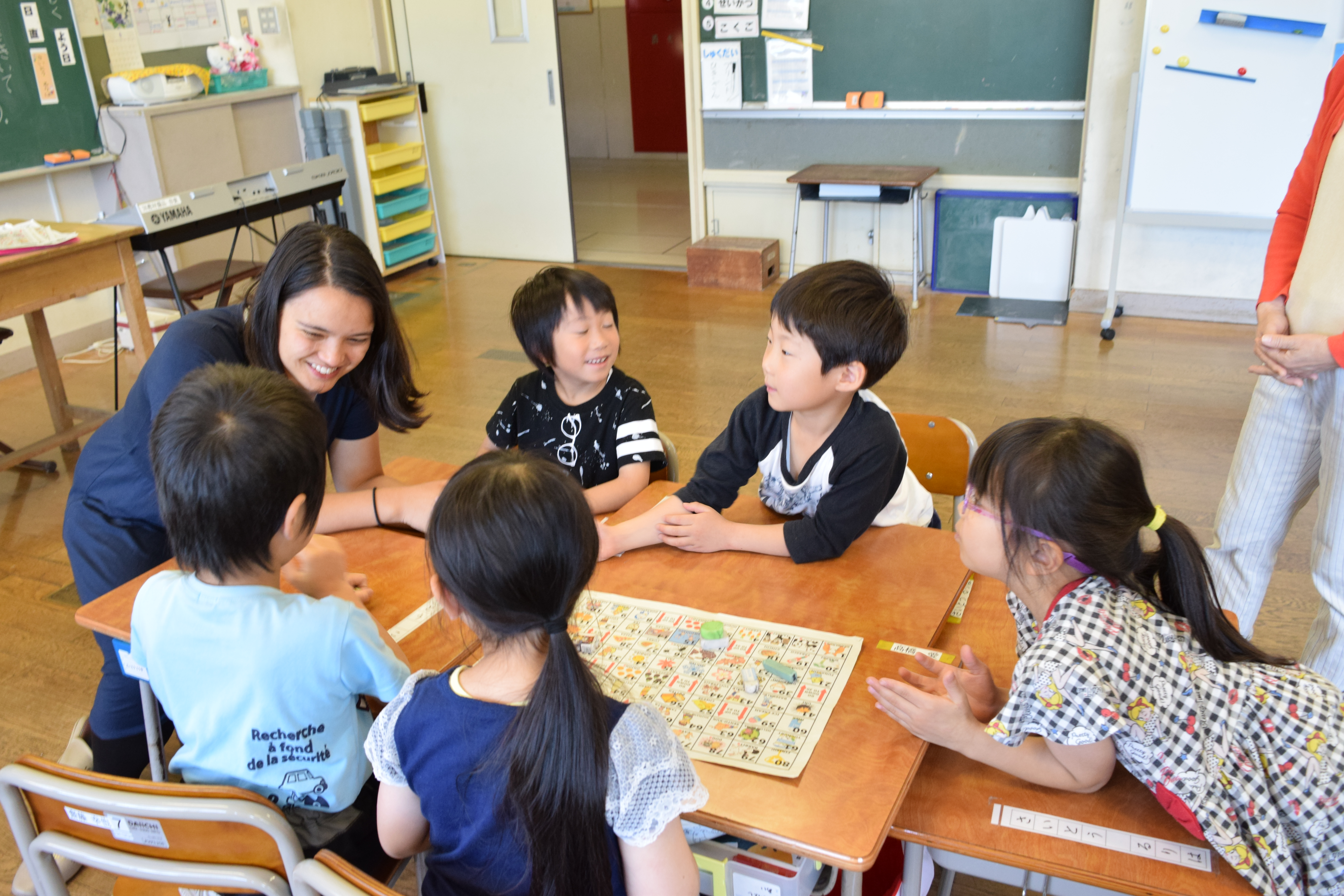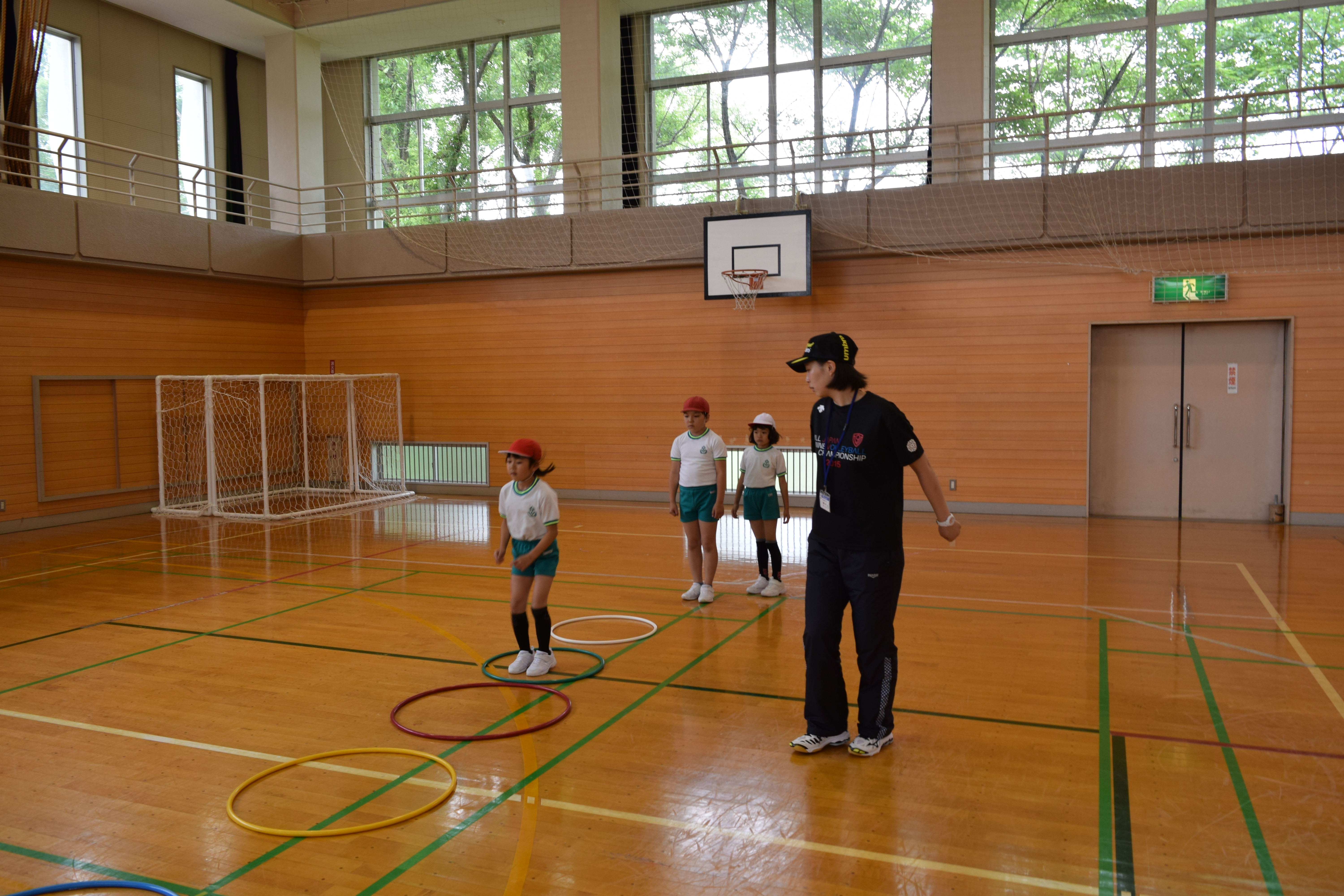 2018年6月18日 16時22分午前中に引き続き、午後は昼休みの全校遊びでボールを使った「だるまさんが転んだ」を教えていただきました。初めてのルールでしたが、みんなすぐに覚え、楽しく活動していました。5校時は、5・6年生の高跳びの授業を一緒に行いました。助走のリズムや足の上げ方などに注意して活動していました。放課後は、3から6年生が、ゲームを通して体づくりに取り組みました。今日1日、新しいゲームや運動のポイントについて教えていただき、全員が楽しみながら、心地よい汗を流していました。