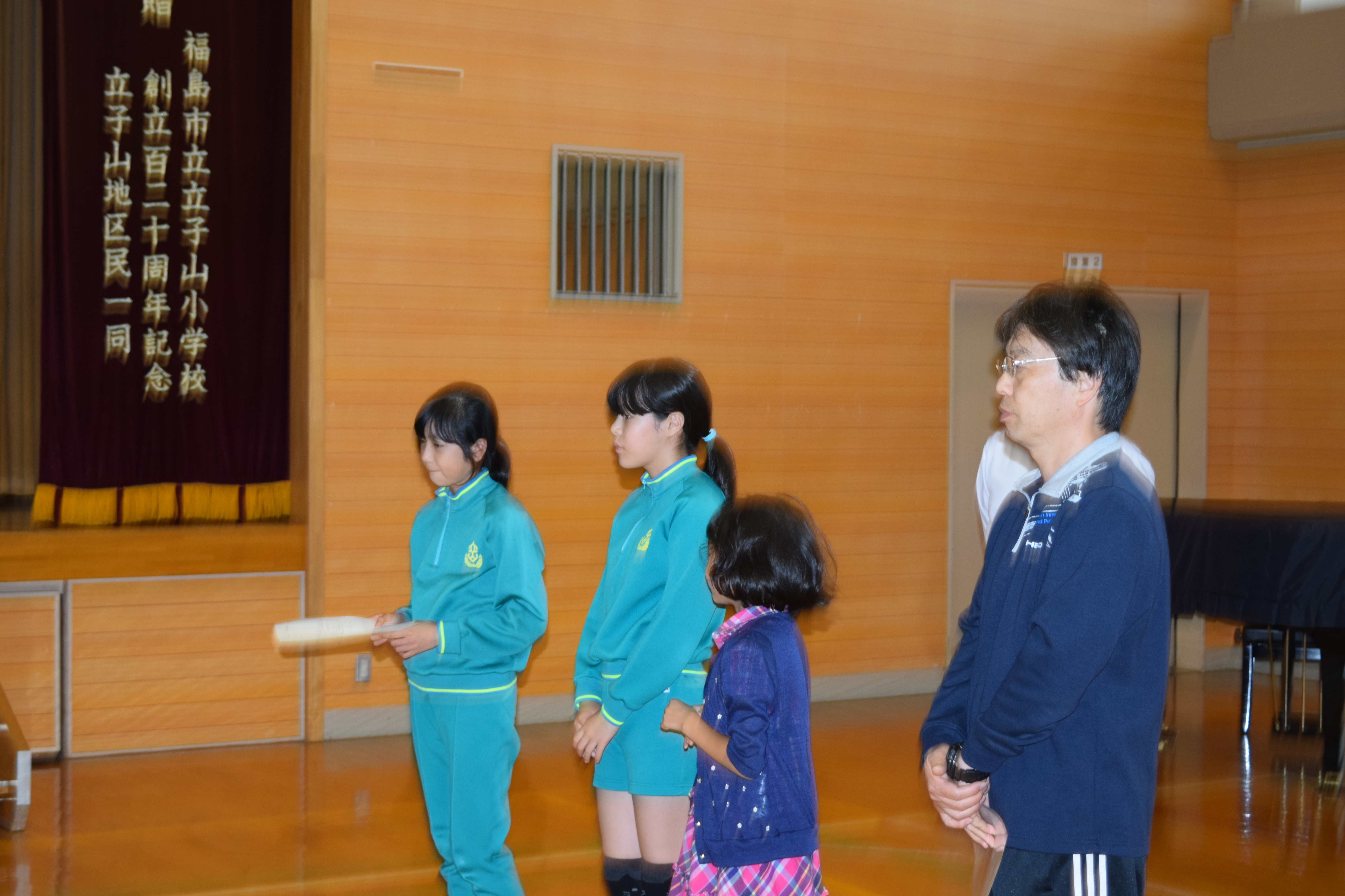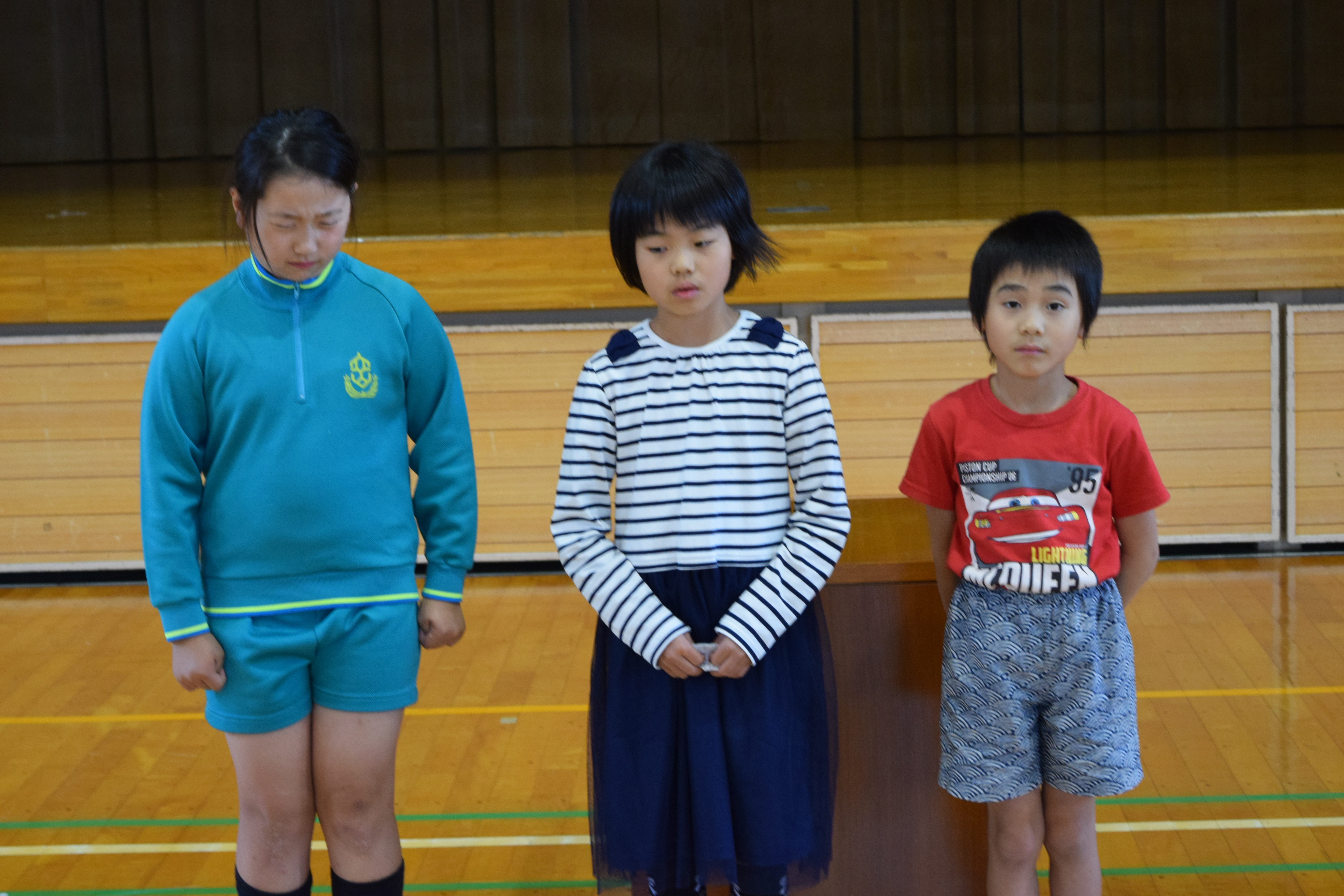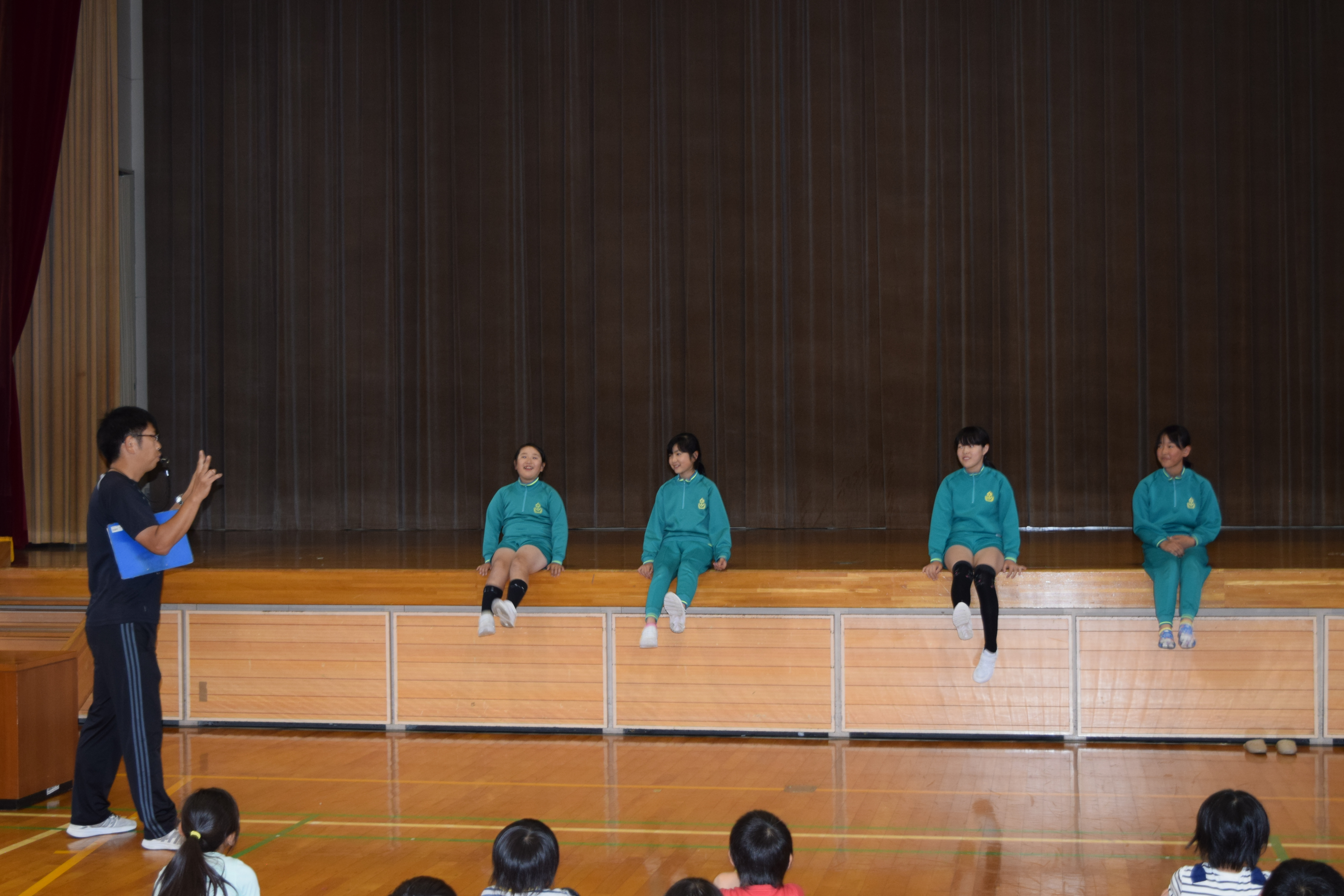 あいにくの天候のため、体育館でプール開きを実施しました。