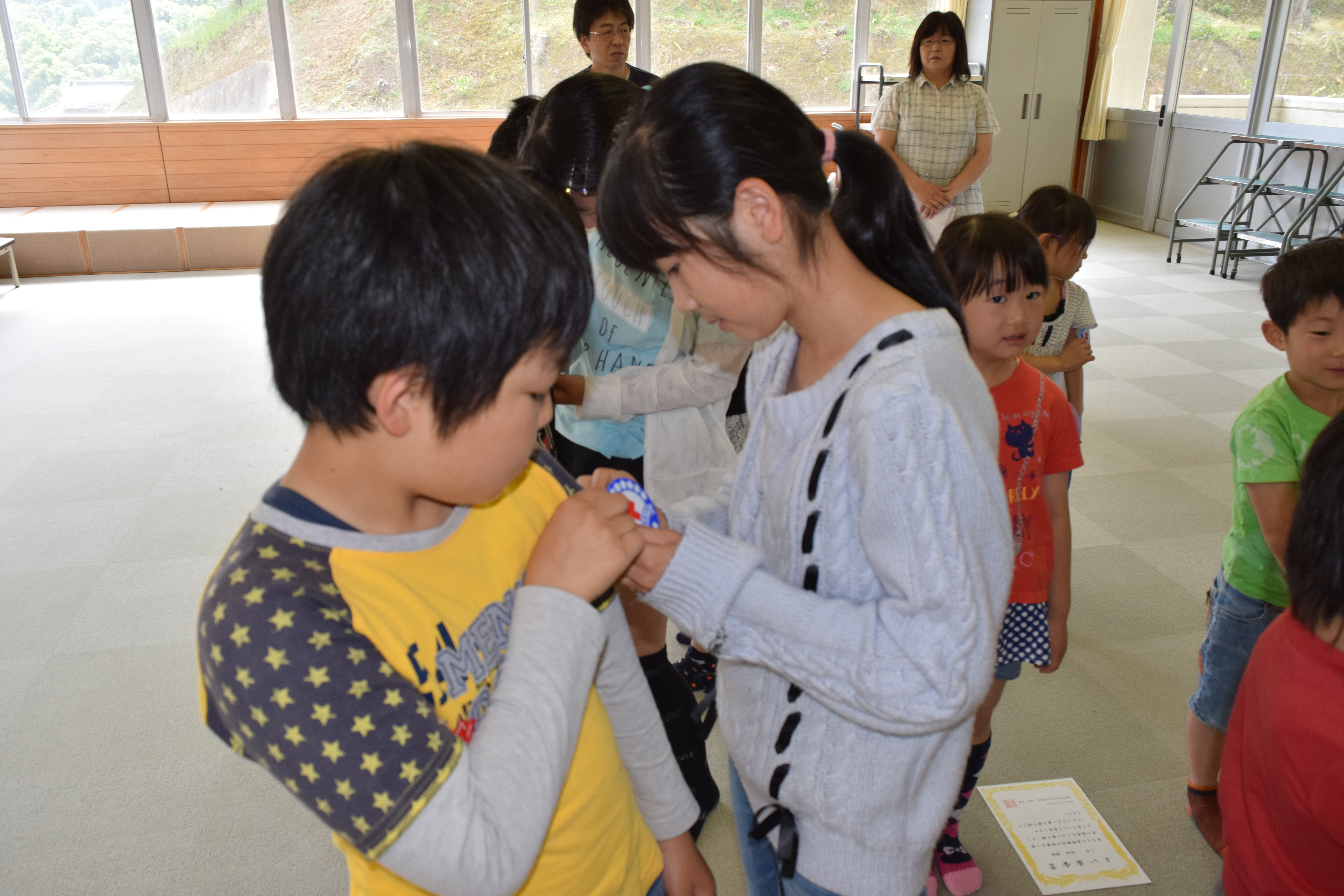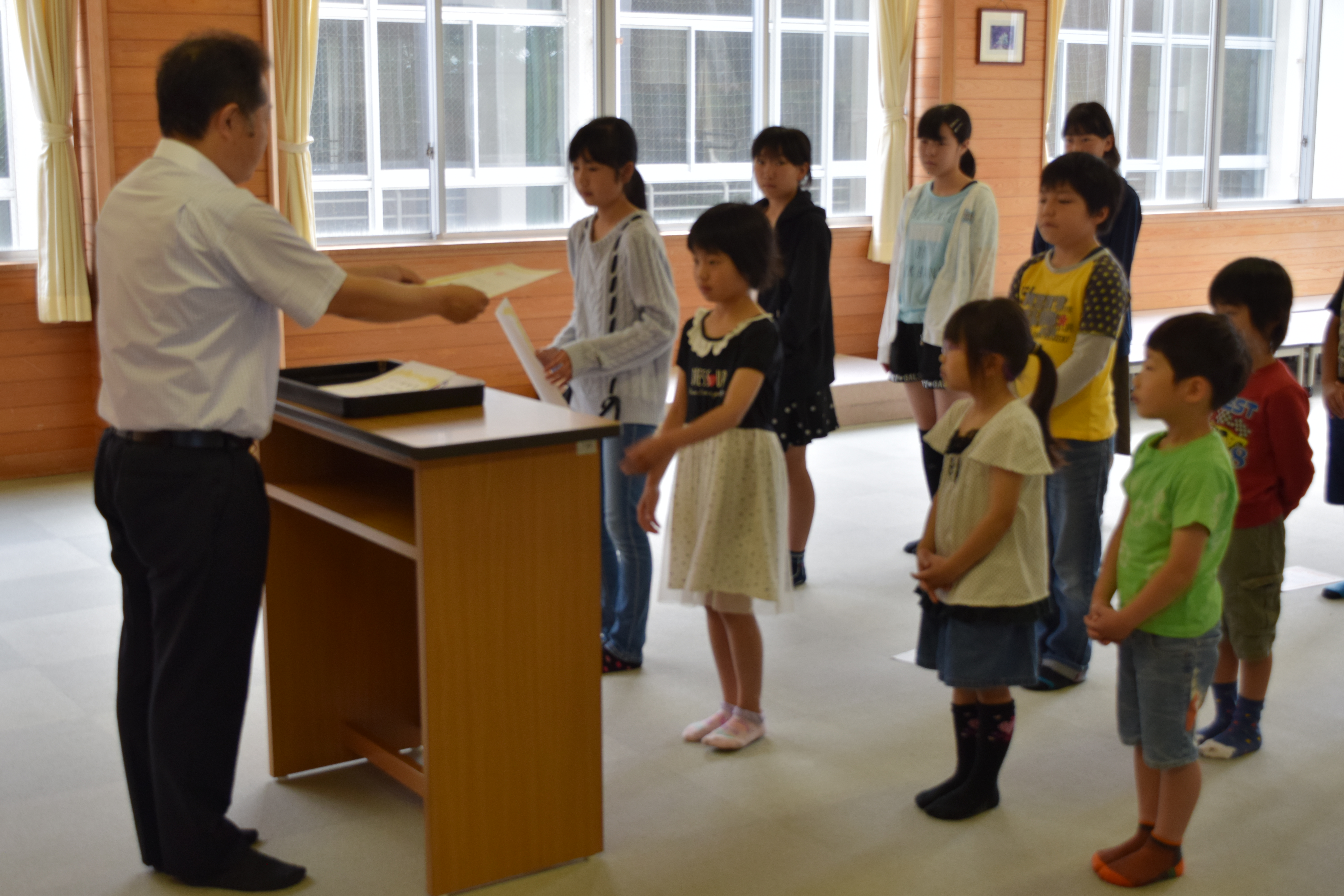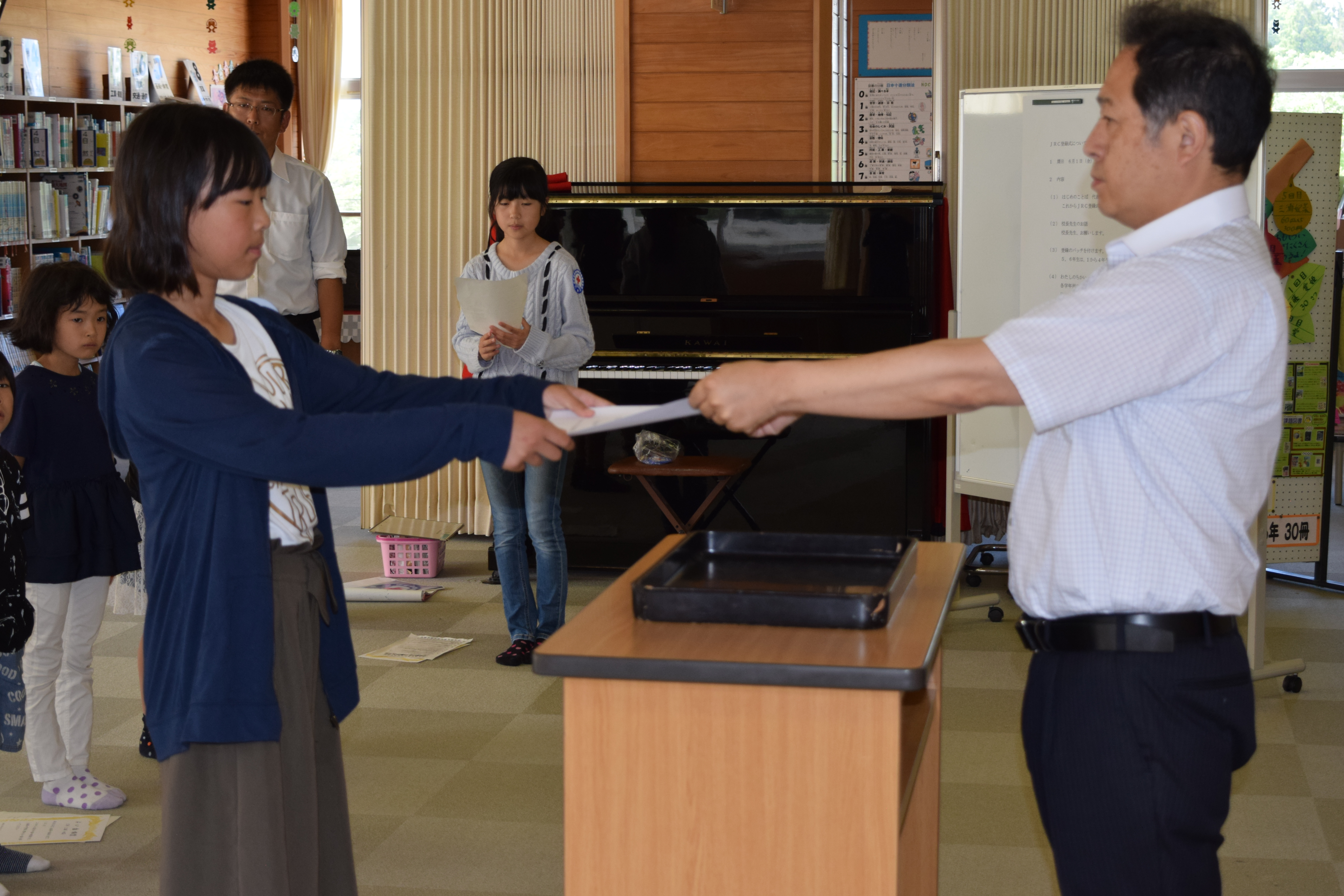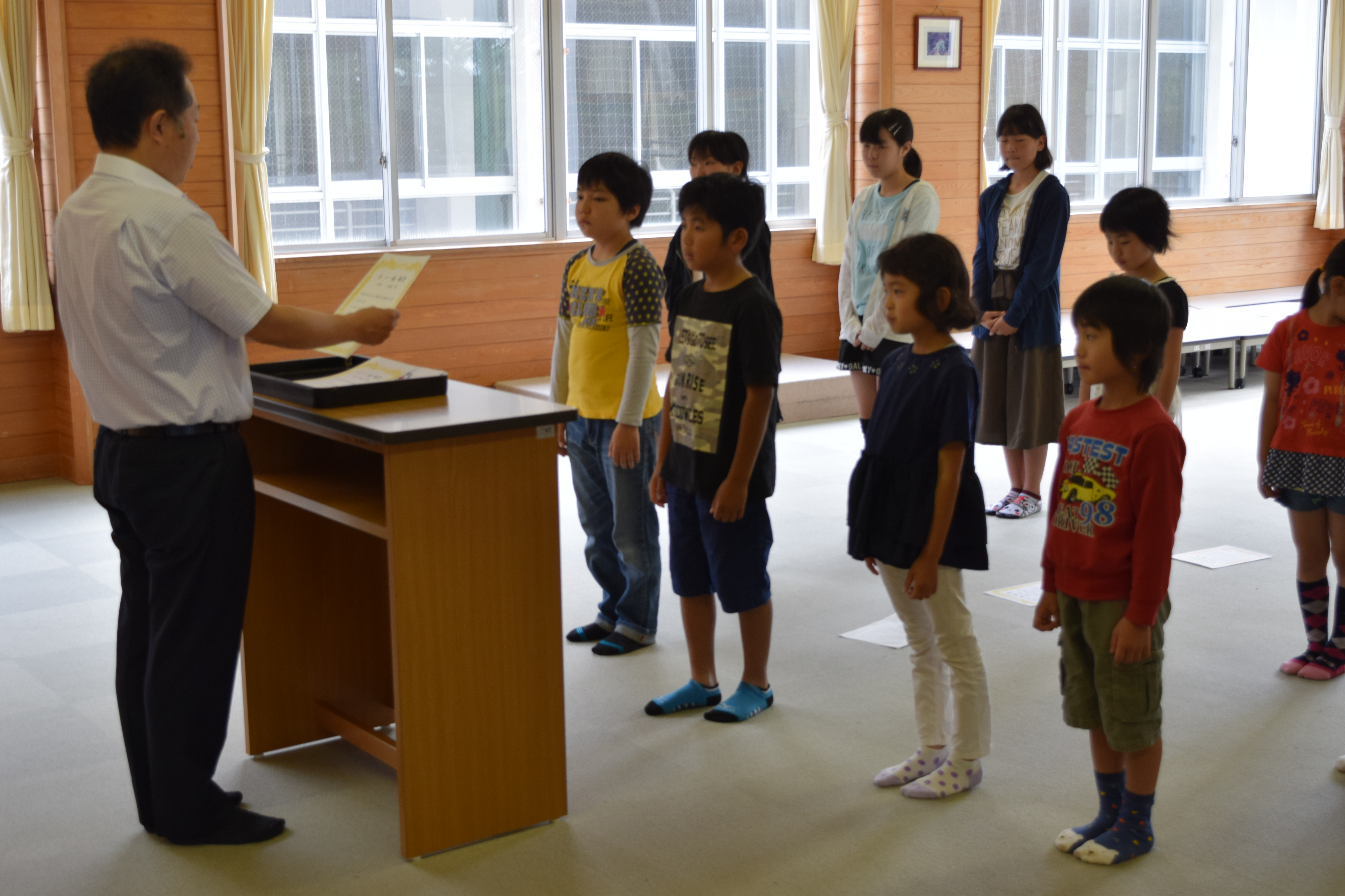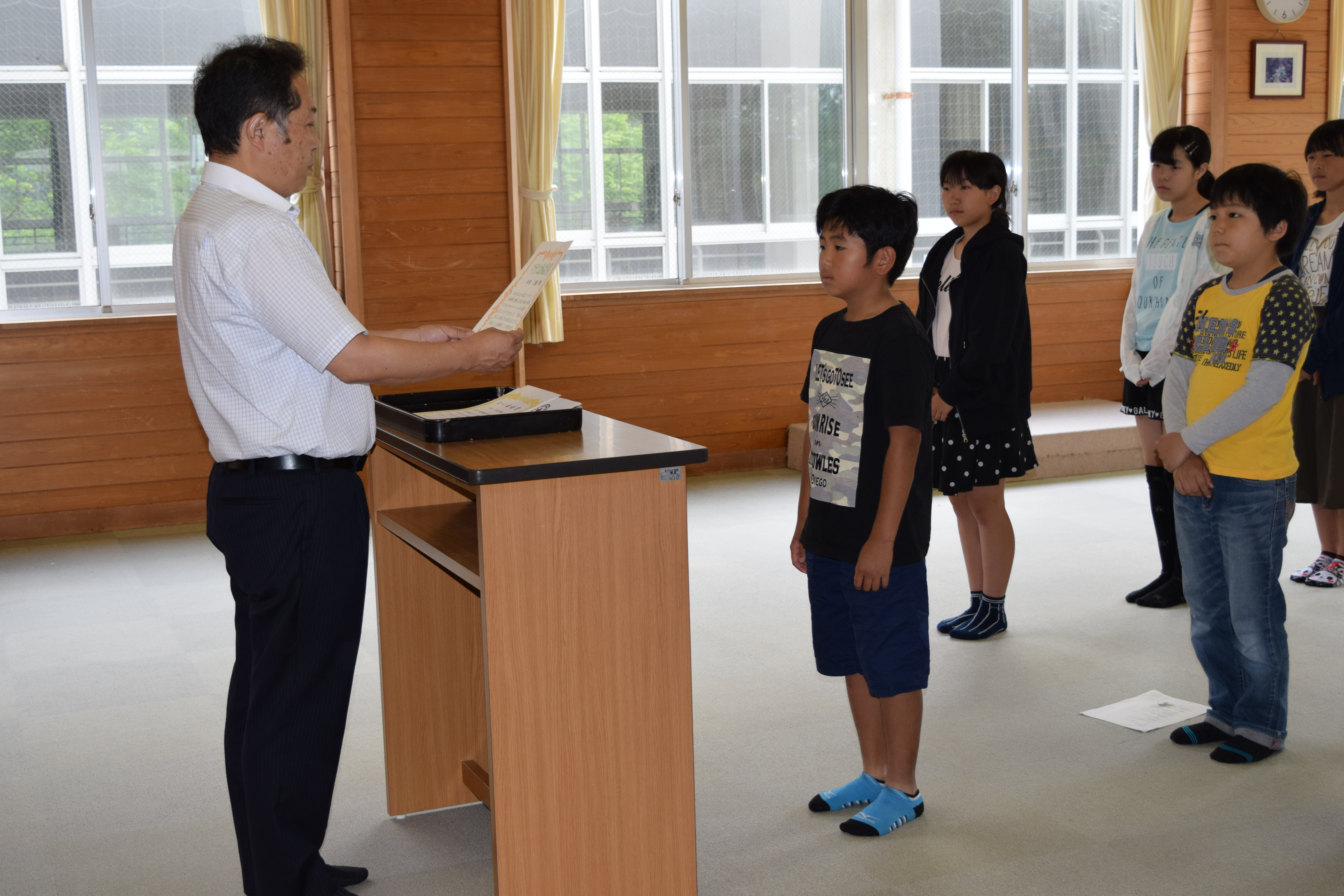 全校朝の会の中で、朝の時間を活用しマラソンの目標を達成した児童に「マラソンがんばり賞」が、また、歯科検診で異常がなかった児童並びにむし歯等の治療が終了した児童に「よい歯 金賞・銀賞」の表彰が行われました。