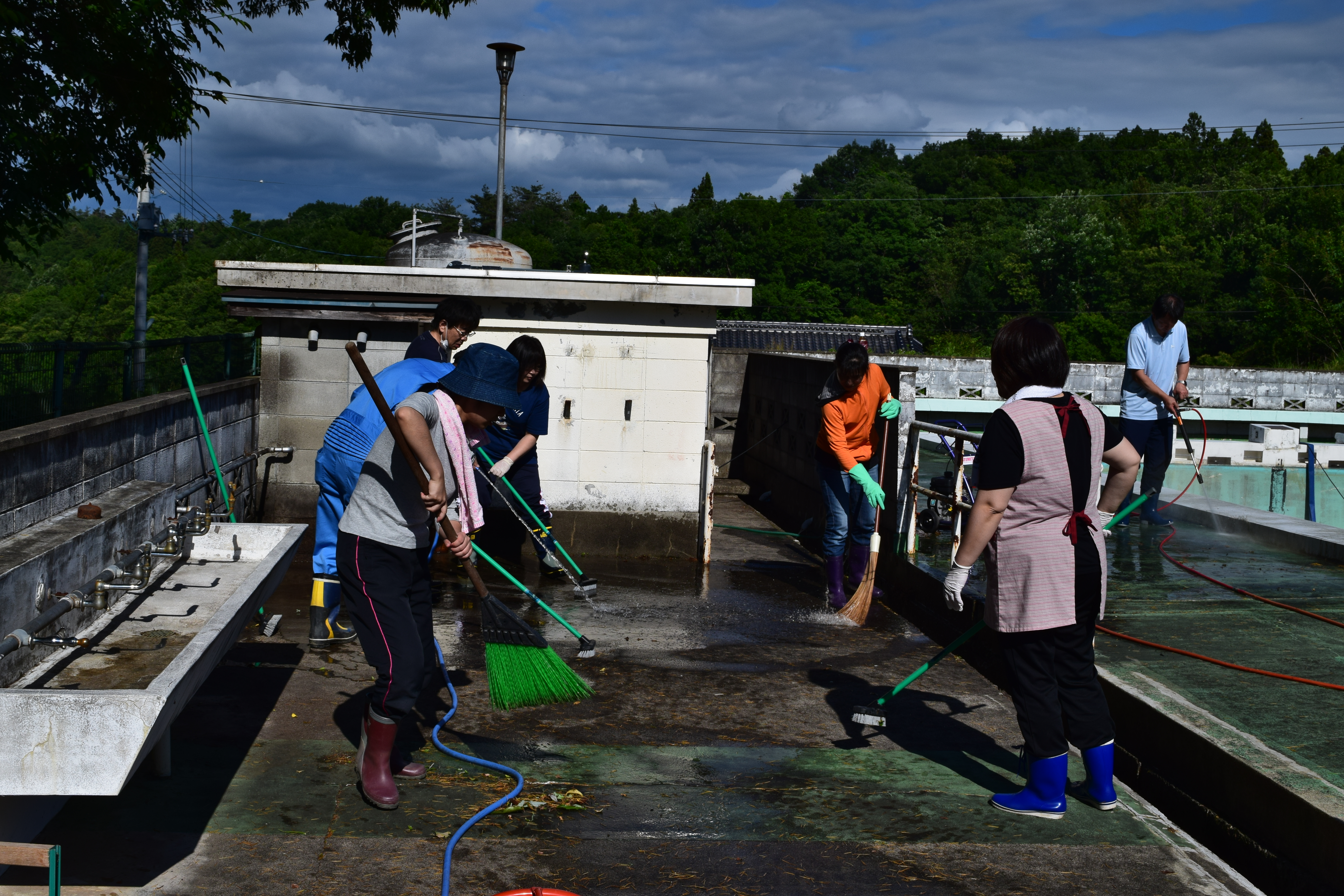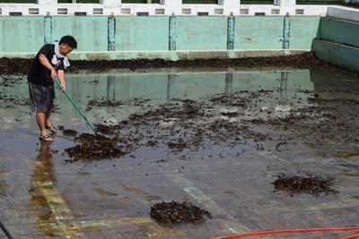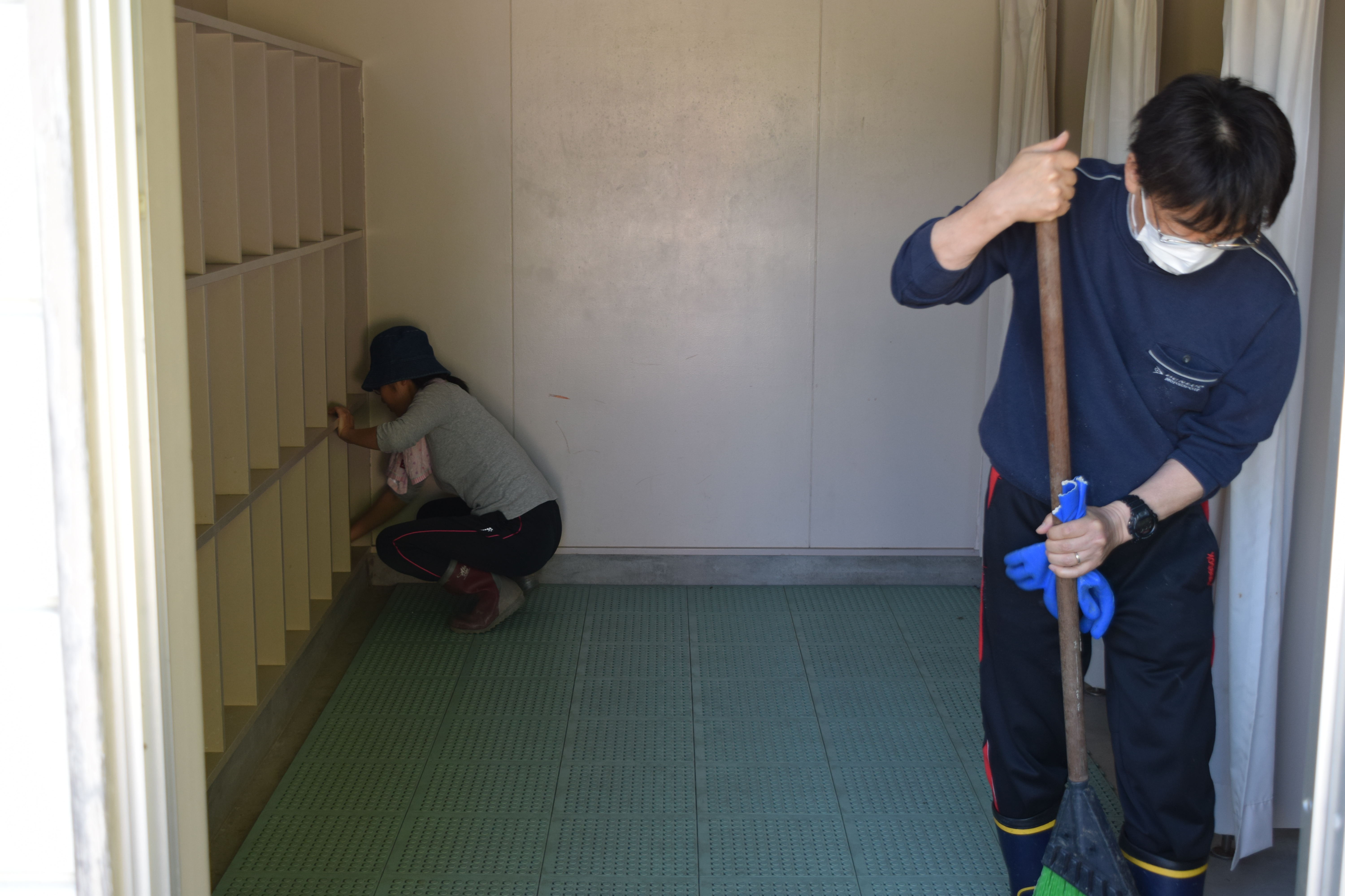 プール清掃第3日目 今日も保護者の方4名(卒業生の保護者を含む)の協力によりプール清掃を実施しました。今日はプールサイドと更衣室を中心に清掃していただきました。