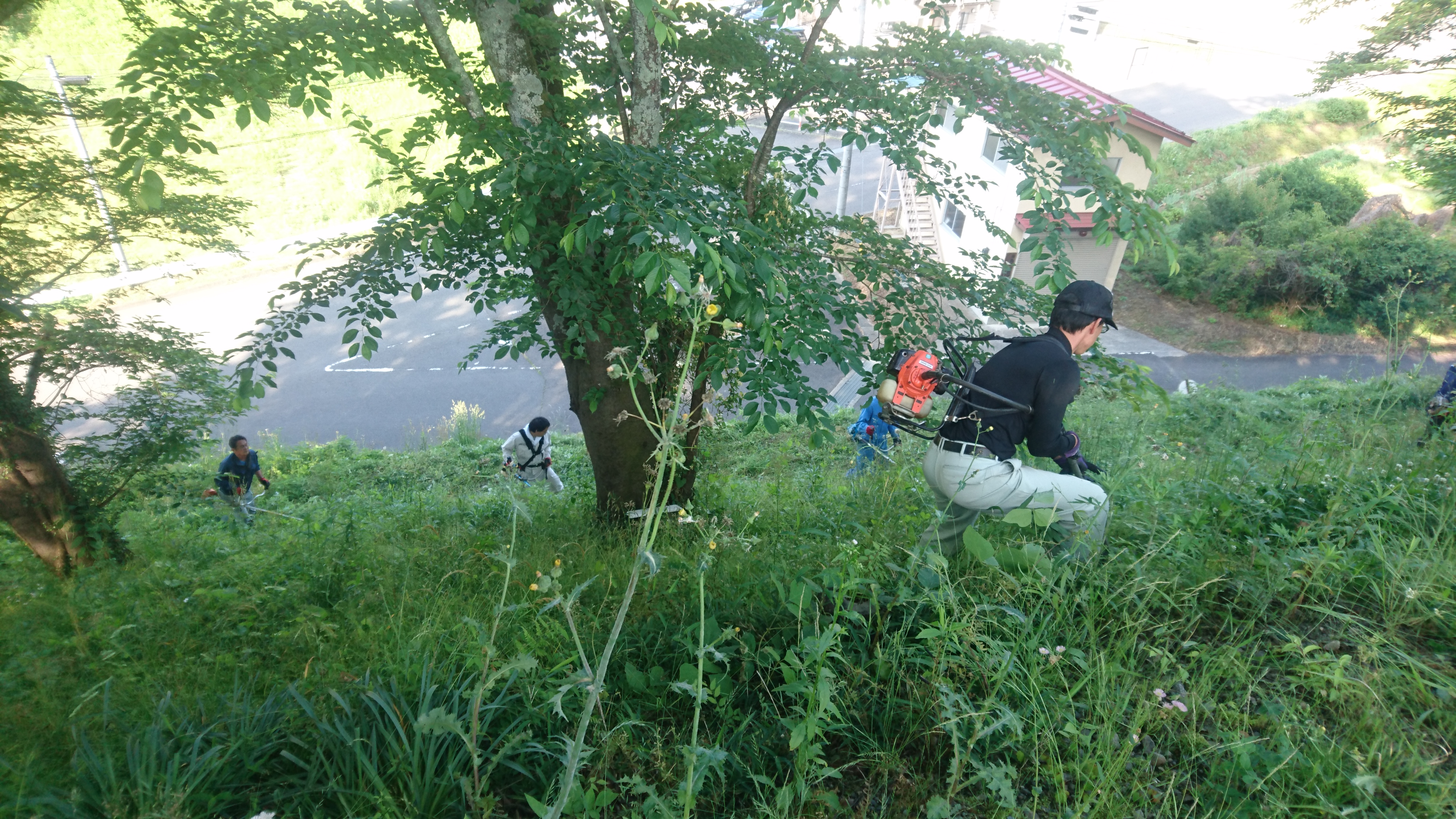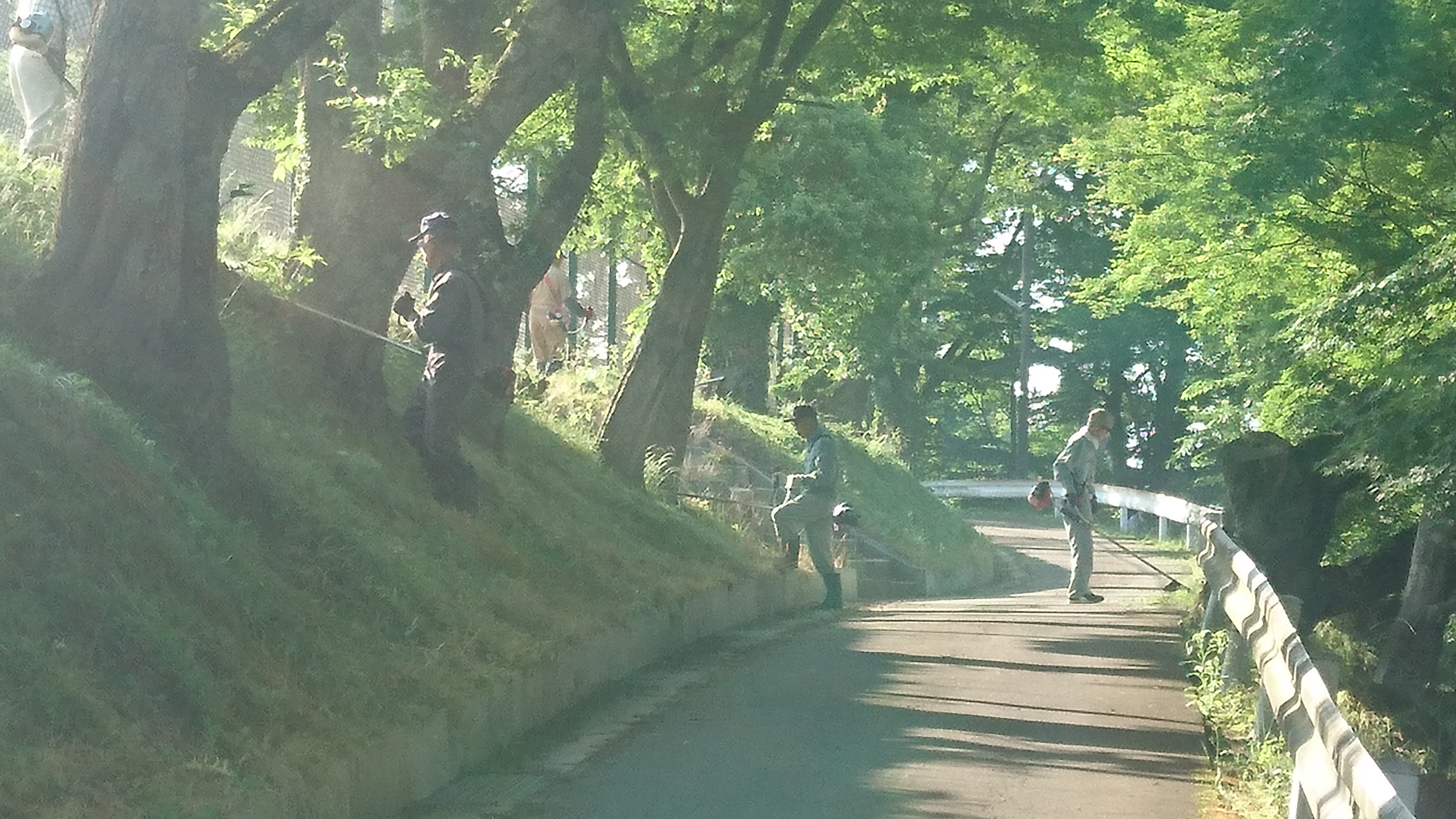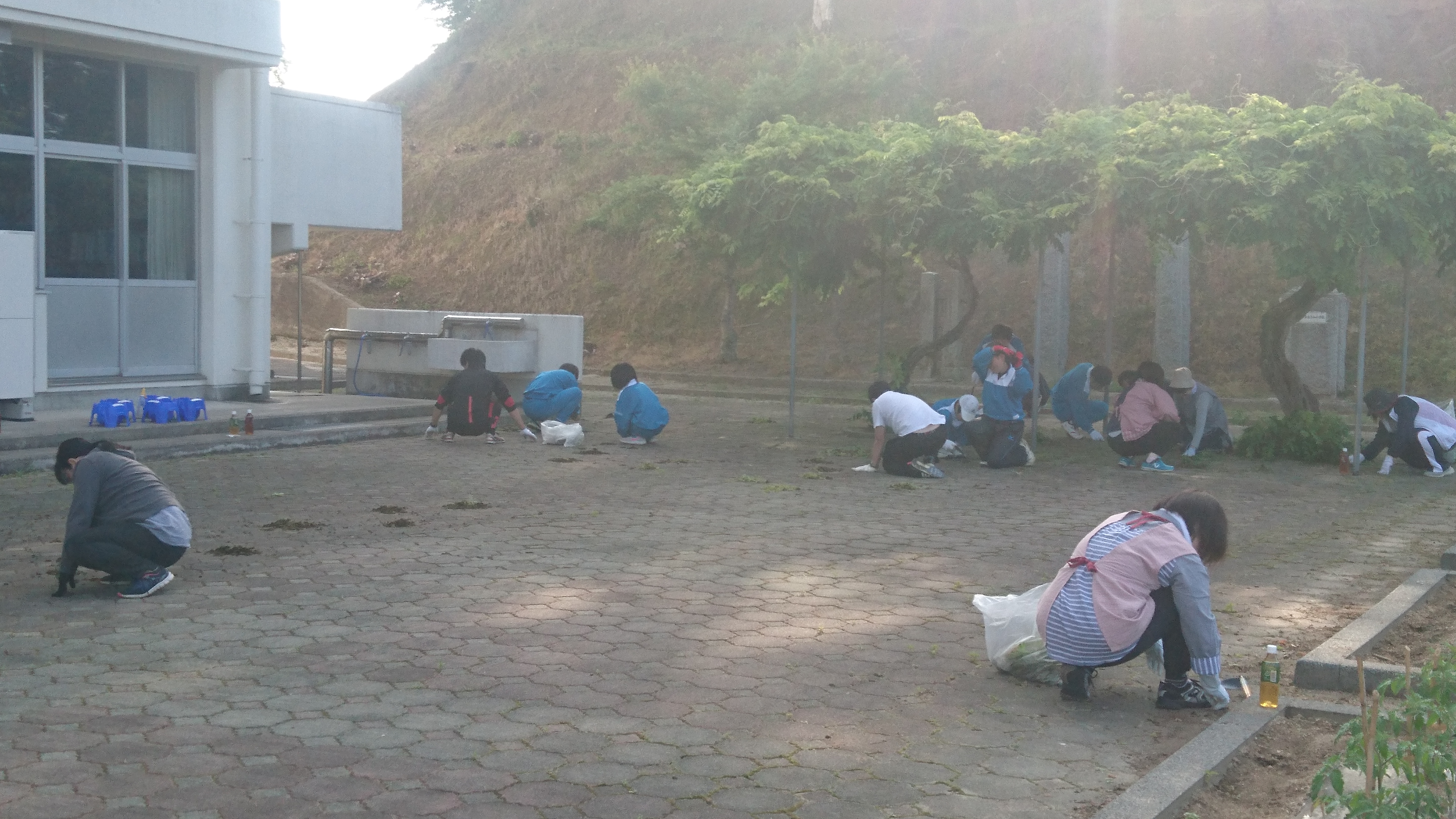 青空が広がる爽やかな朝です。6時から、保護者、児童生徒、教職員、地域のかたを合わせて約100名が集まり校地や園庭の除草作業に協力いただいています。