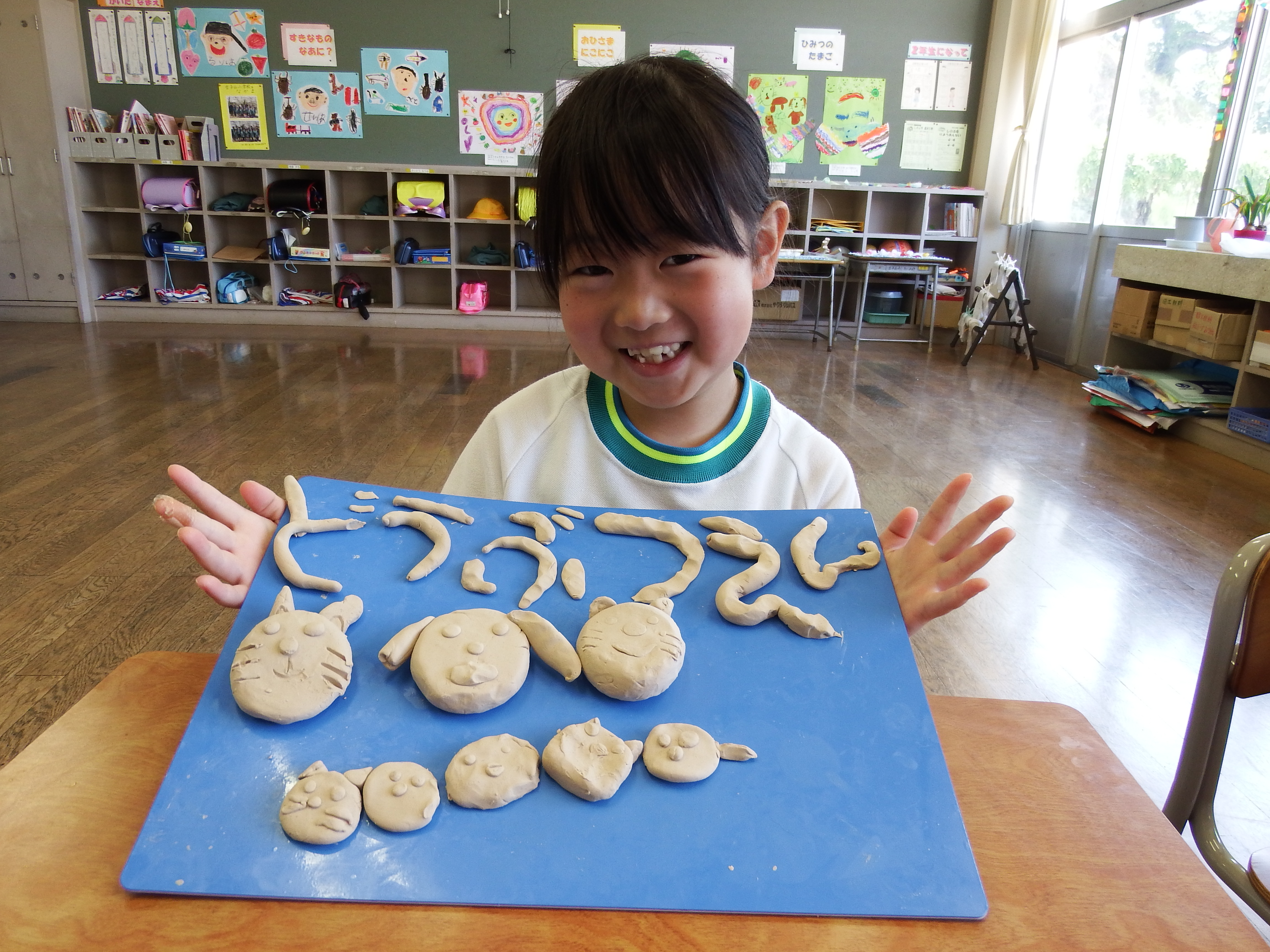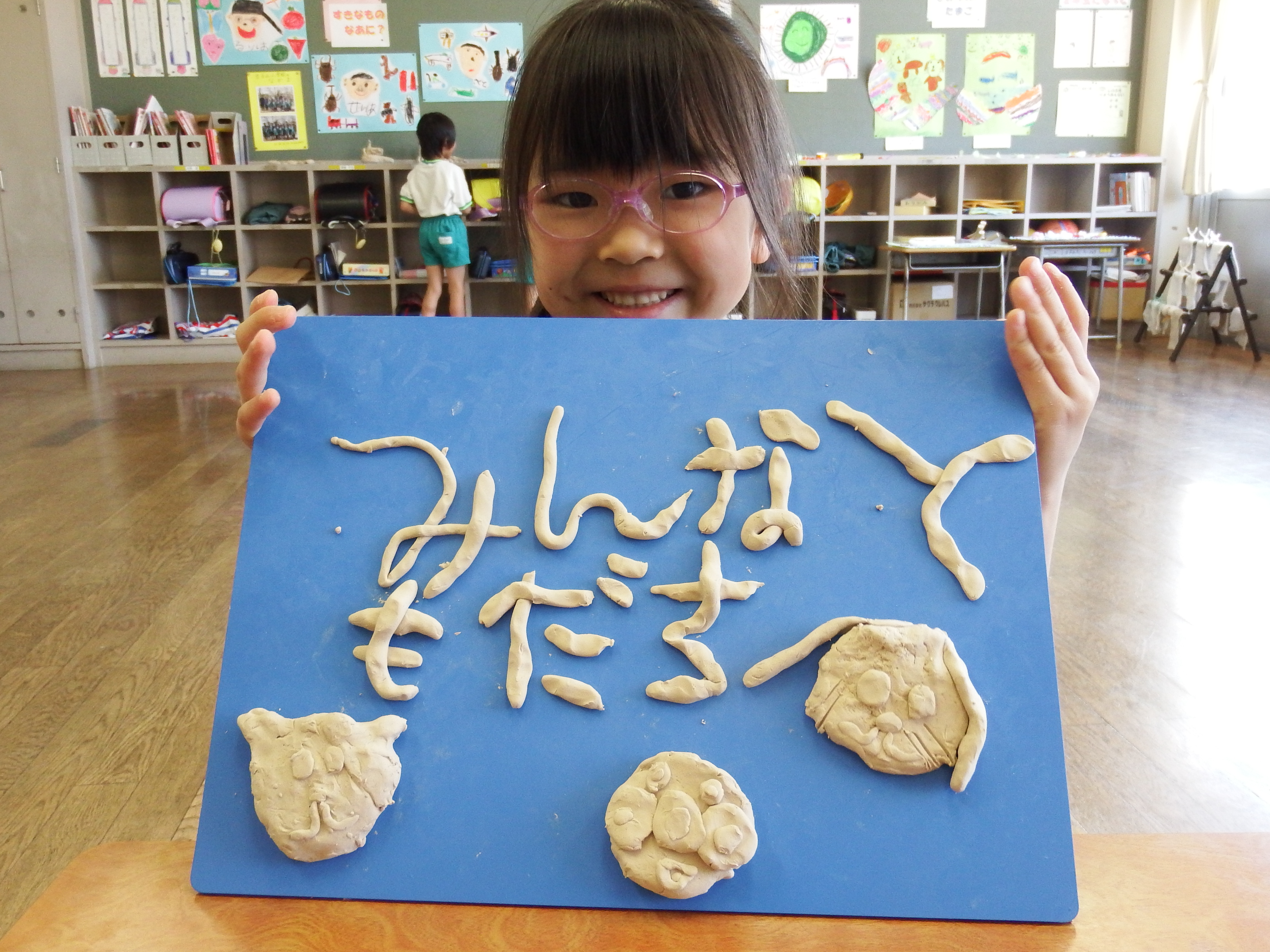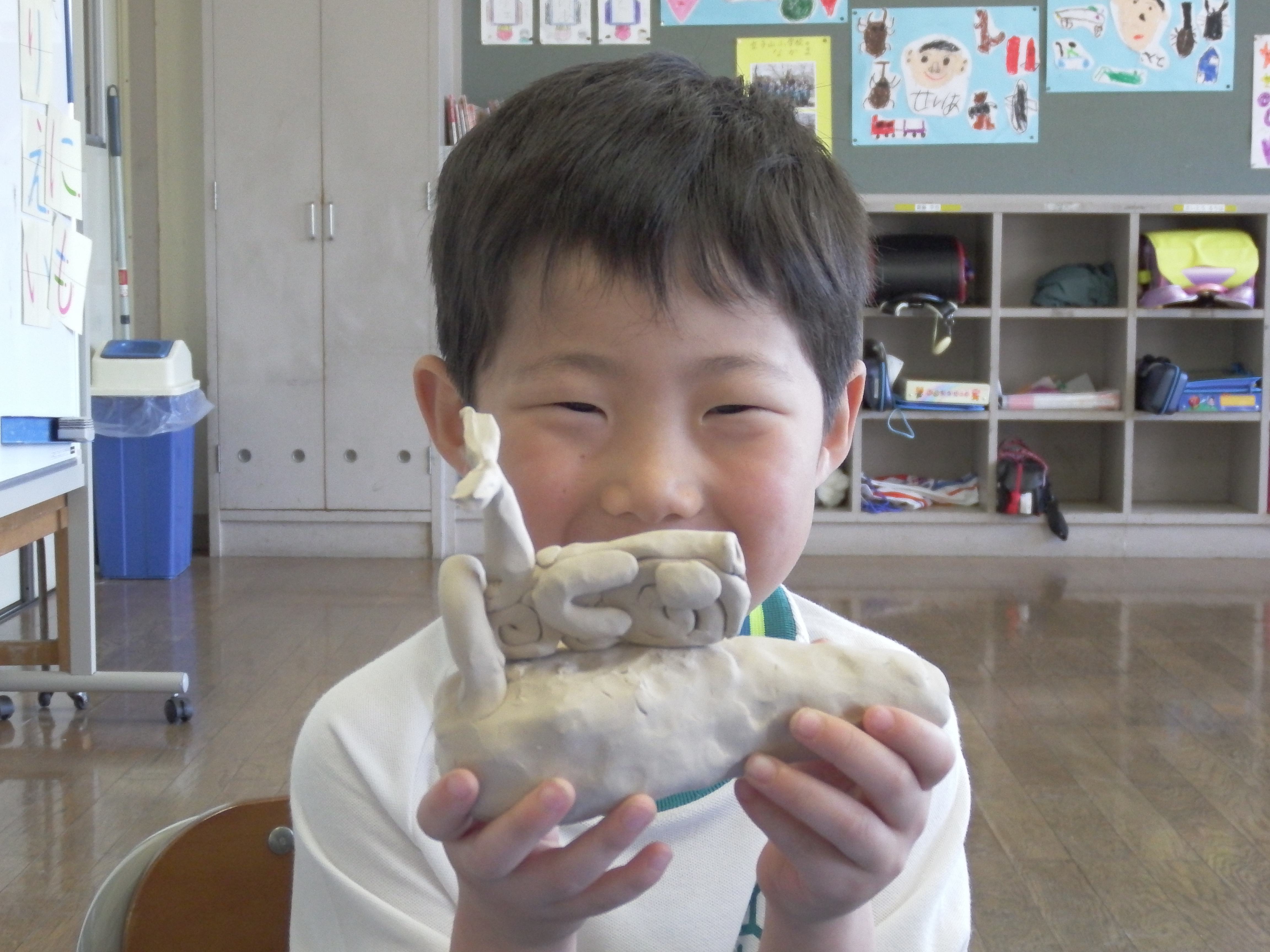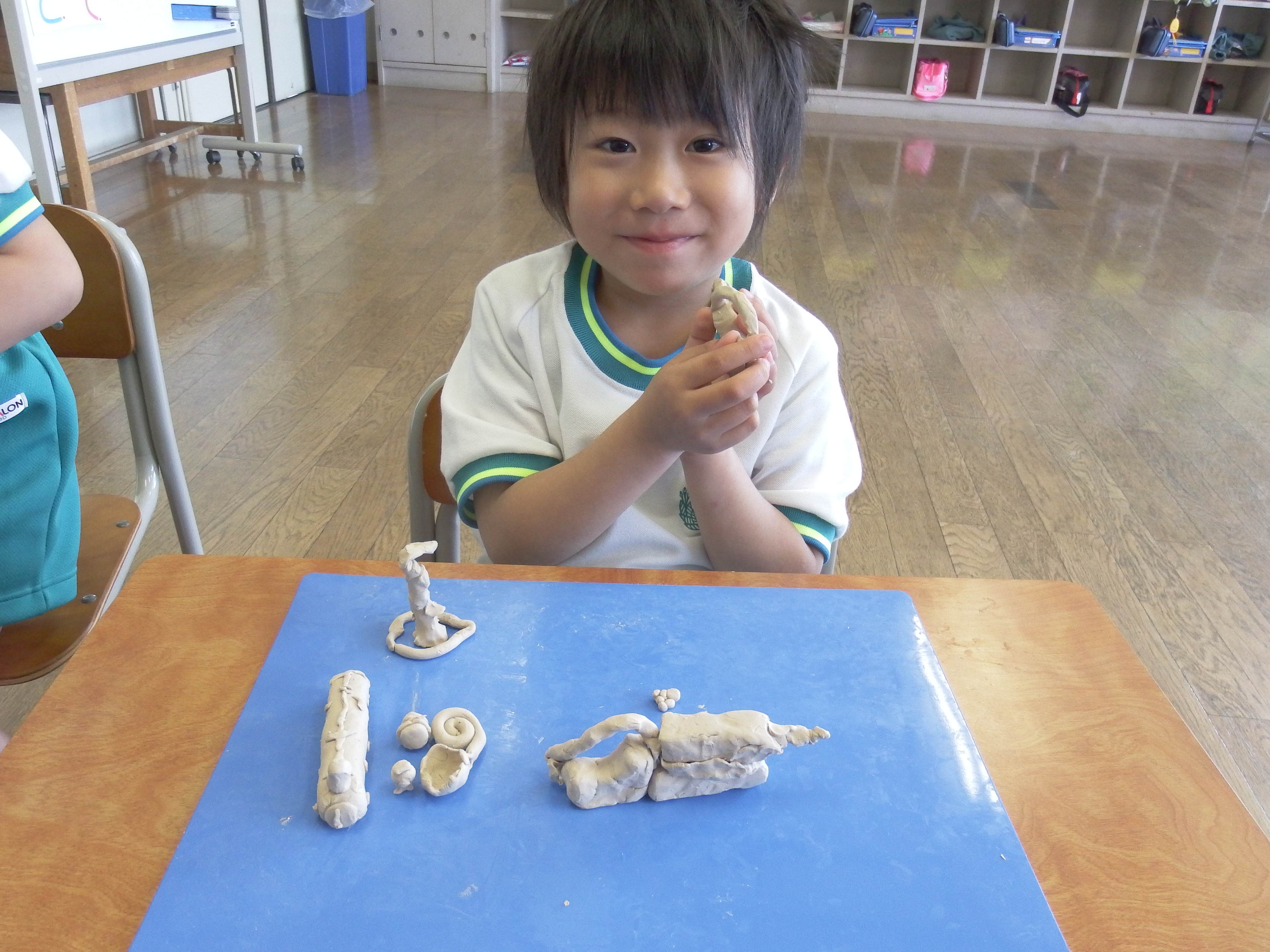 2年生の男の子はねんど球がうまく転がるよう工夫してスライダーをつくりました。1年生の男の子はバイク、電車など興味のあるものをいろいろとつくりました。女の子は仲良く動物の顔を上手につくりました。造形遊びなどをとおして創造力を伸ばしていきます。