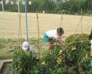 夏休み直前に、赤くなり始めたトマト。今日は、プール開放に参加した児童が、収穫のお手伝い。