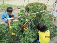 2017年7月27日 14時18分夏休み直前に、赤くなり始めたトマト。今日は、プール開放に参加した児童が、収穫のお手伝い。