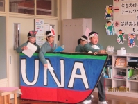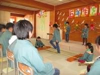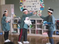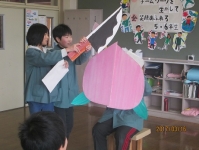 5、6年生が桃太郎を、英語の劇として発表しました。発表会は、1~4年生を招待して昼休みに行われました。ストーリーは下級生も知っているのですが、英語で聞くとまた別の面白さがありました。上級生が小道具を使ってお芝居をしてくれたので、とても楽しく鑑賞できました。