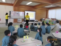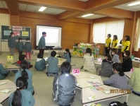 食育の出前講座「スナックスクール」を活用して、親子で「おやつ」について考えてみました。講師は、カルビー株式会社から来ていただきました。