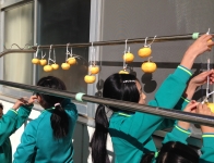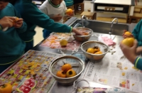 昨年度、畑の先生である髙橋様よりたくさんの渋柿をいただき干し柿にして食べていた児童はその味が忘れられなかったようです。そのため、今年も髙橋さんから柿をいただき、みんなで干し柿を作ることにしました。今日は1~4年生が、皮をむき、ひもで縛り、物干し竿にさげました。完成が楽しみです。