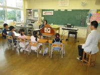 今日の給食の時間、南部学校給食センター所長さん、栄養士さんのお二人が来校して、給食を作っている様子を説明してくださいました。また、栄養士さんからは、紙芝居「骨の話」で骨の役割を教わりました。