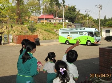 今 年初めてのしのぶ号がやってきました。予定よりも少し遅れたためか、待ち遠しくて外にいた児童。到着したしのぶ号は「ももりん」が描かれ、児童は大喜び。これからもしのぶ号には、たくさんお世話になります。