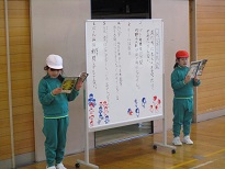 2015年12月21日 14時06分3.4年生が立子山小学校の歴史について調べたことを発表しました。聞き手は,1.2年生と5.6年生です。3.4年生は調べたことを画用紙に整理し,内容を原稿を見ないで分かりやすく伝えようと取り組みました。聞き手も本気に聞いています。初代校長先生は30年も勤めたこと,昔は400名以上の子供が通ってきたことなどを,驚きをもって聞いていました。