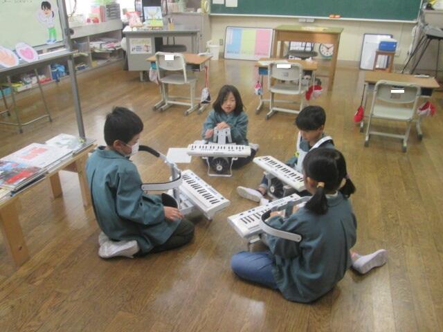 登校後の子どもたちは、ホールや教室に集まり、鼓笛の練習を行っています。6年生をはじめ上学年の子が自分の経験を生かして、下級生のそばで演奏を教えています。立子山小の新しい鼓笛隊をつくる活動が進行しています。