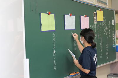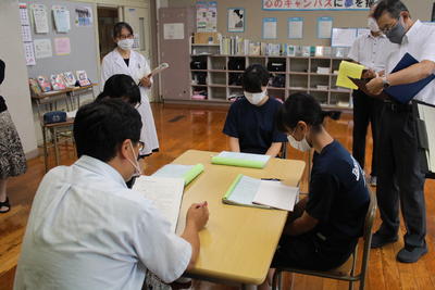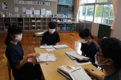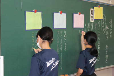 2年国語。枕草子を題材に自分の考えを述べ合っていました。