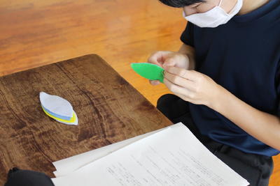 3年家庭科。小さな子のためのおもちゃ作り。ボールを製作中です。