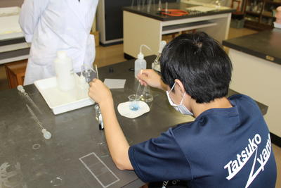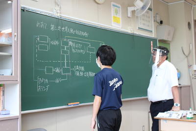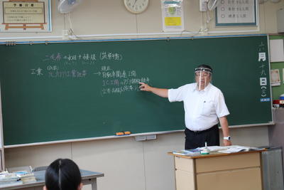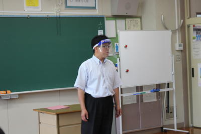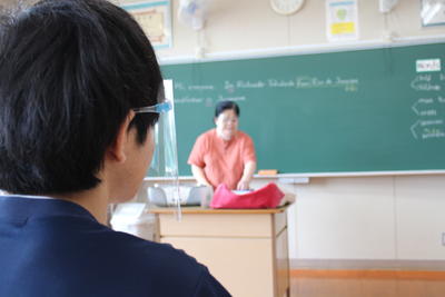 3年生。英語の時間にフェイスシールドをつけて授業に臨んでいました。口の動きが分かりやすくなったようです。