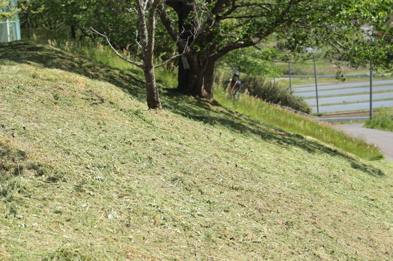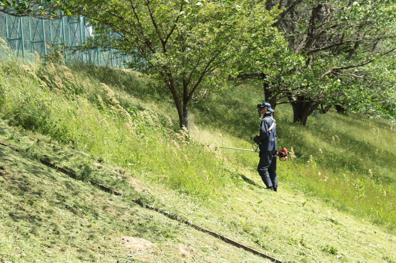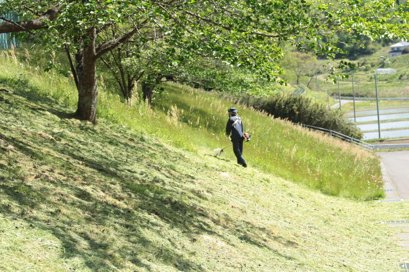 学校では、毎日校舎内の除菌作業を行っていることは以前にもお知らせしていました。今日は、学校の周りもきれいに整備していることをお知らせします。毎年のことですが、春から秋にかけ(5月~10月くらい)校庭や学校の周りは雑草だらけになってしまいます。そこで、技能主査の二階堂さんが計画的にこの広い校地の除草作業を行ってくれています。今日も風が強くて、暑い中ですが、校門側の法面を丁寧に草刈りしていただきました。学校は、いつでも再開できるよう環境整備も含め万全の準備をしています。