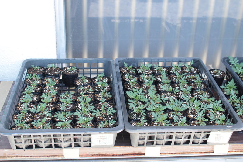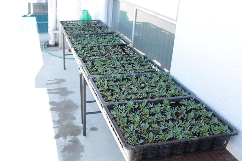 体育館前では、二階堂さんがマリーゴールドを種から育て始めています。校舎前の花壇にきれいに咲き誇る日が楽しみです。