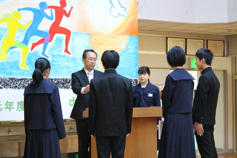 役員任命式と表彰伝達 2019年11月5日 08時08分 11月1日(金)に、任命式を行い、生徒会役員、学級委員へ任命書を手渡しました。また、各種大会やコンクールなどで入賞、入選した表彰を行いました。全員が、それぞれの目標に向かって努力を継続しています。