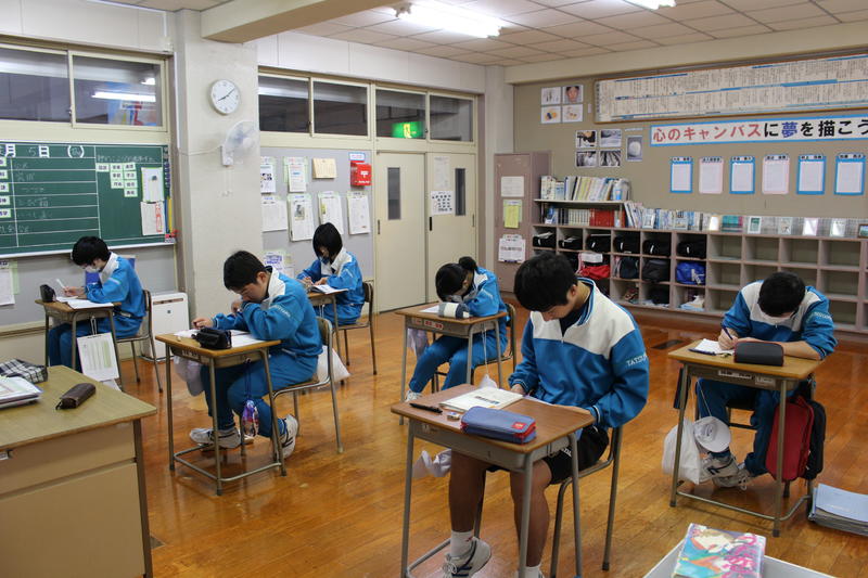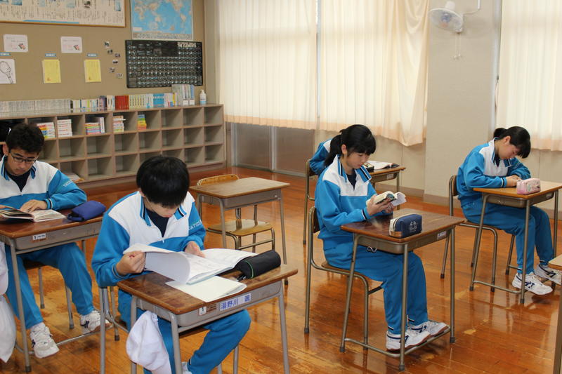生徒たちの登校後、朝の短学活前までの「立中タイム」の様子です。1,2年生は、読書。3年生は、教科の学習に取組んでいます。