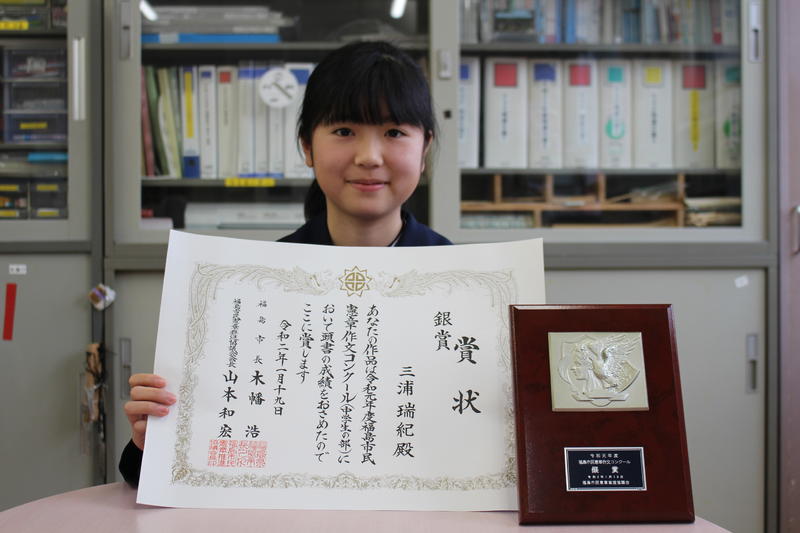 令和元年度福島市民憲章作文コンクールにおいて、本校1年三浦瑞紀さんが表彰されました。おめでとうございます。