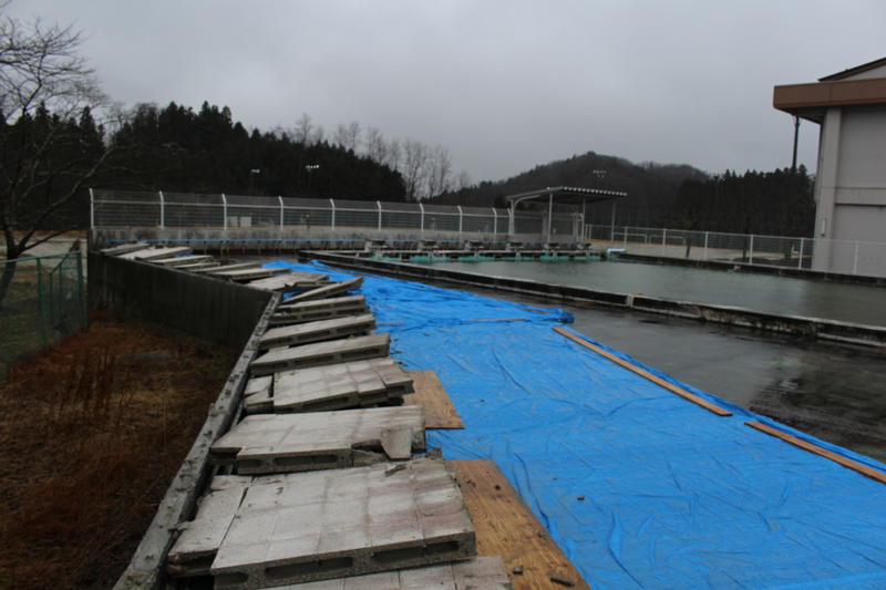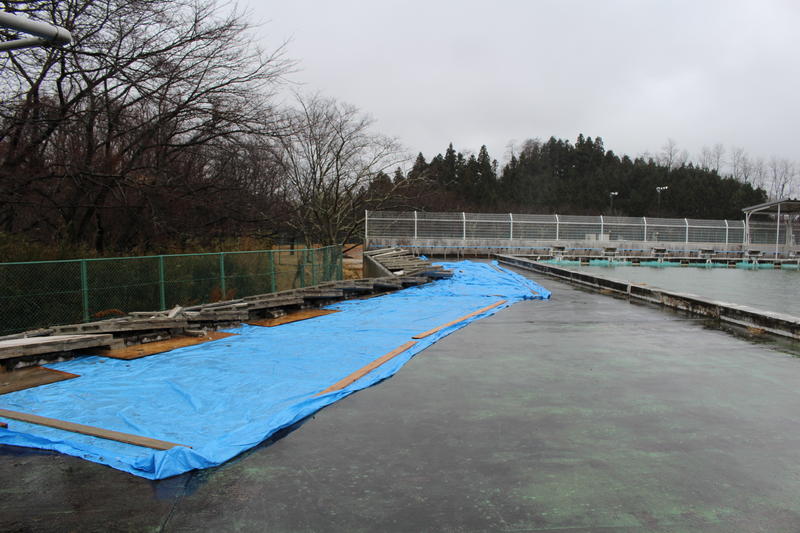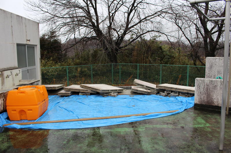 現在、学校プールの外壁となるブロック塀の改修工事を行っています。子どもたちの安全確保のための工事です。