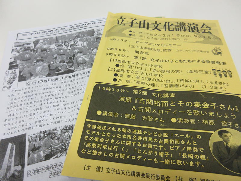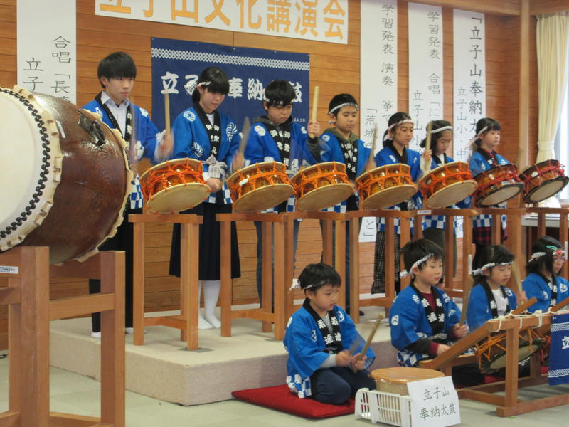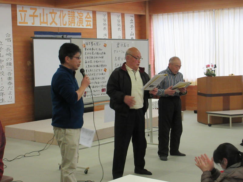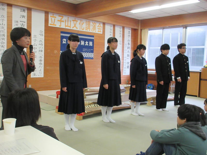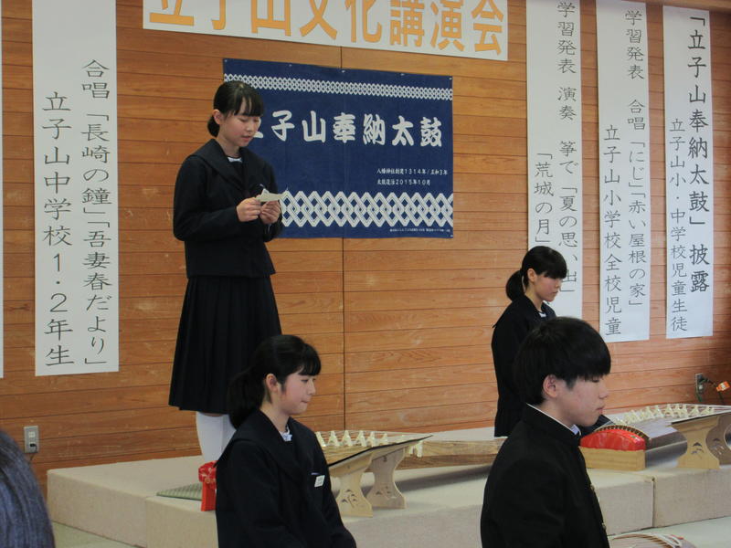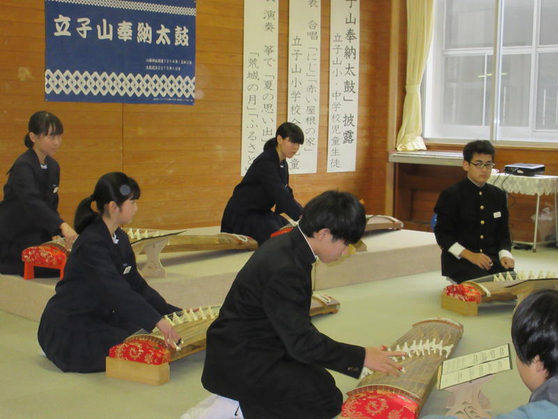 2月16日(日)立子山小学校のホールを会場に、立子山文化講演会が開催されました。メインとなる文化公演の前に、小・中学生による学習発表の機会をいただきました。中学校からは、1・2年生による琴の演奏と合唱の発表を行いました。講演会後の古関メロディー全員合唱では、本校のPTA会長をはじめ、普段からお世話になっている地域の皆様も大活躍でした。