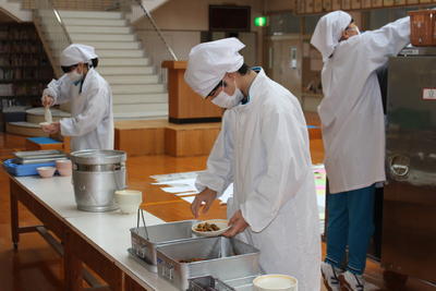 給食の時間。緊張から解放された3年生。楽しそうに給食の準備をしていました。