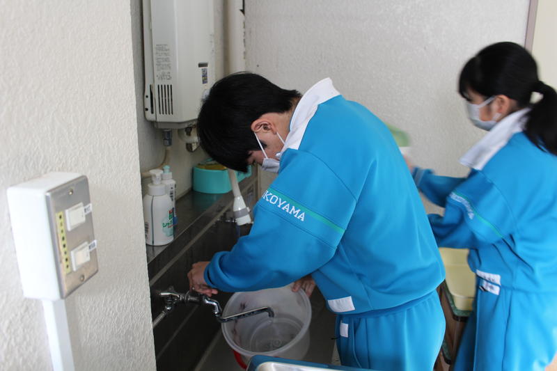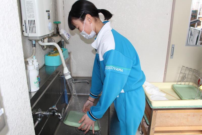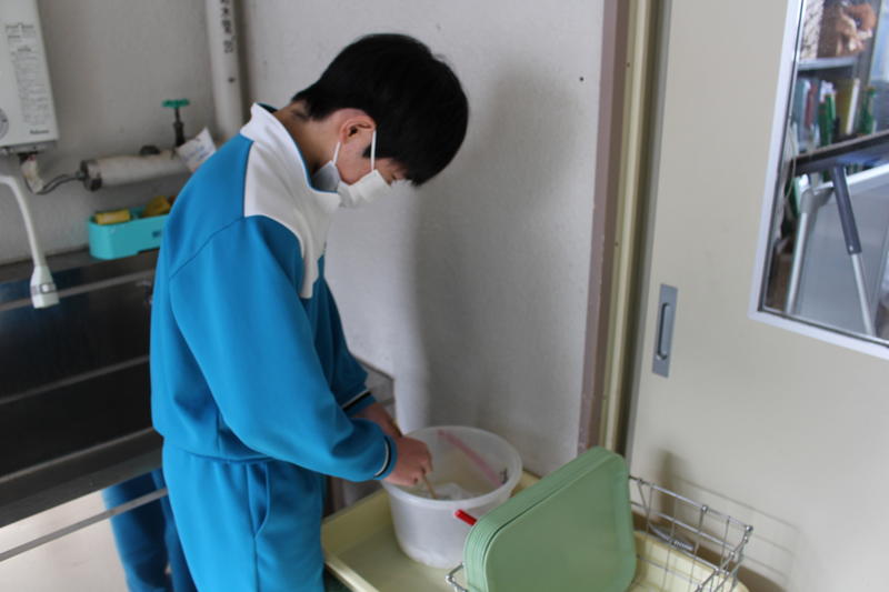 給食後の日課です。自分のお盆を各自洗い、当番で、お盆を拭いた布巾の除菌を行っています。