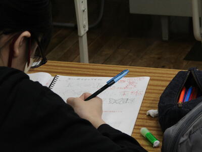 どのようなデザインがよいか、どうしたらよりよく表現できるかなど、美術の先生の例を参考にしながら、生徒さん一人一人が工夫をしていました。