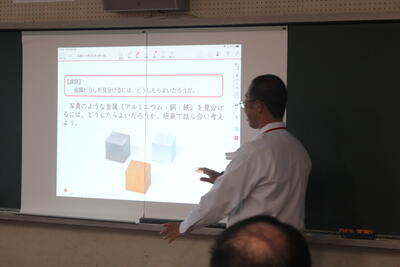 生徒さんはこれまでの経験や学習をもとに、「色などの見た目」「溶ける温度」「磁石を近づける」「値段」などの予想を立てました。