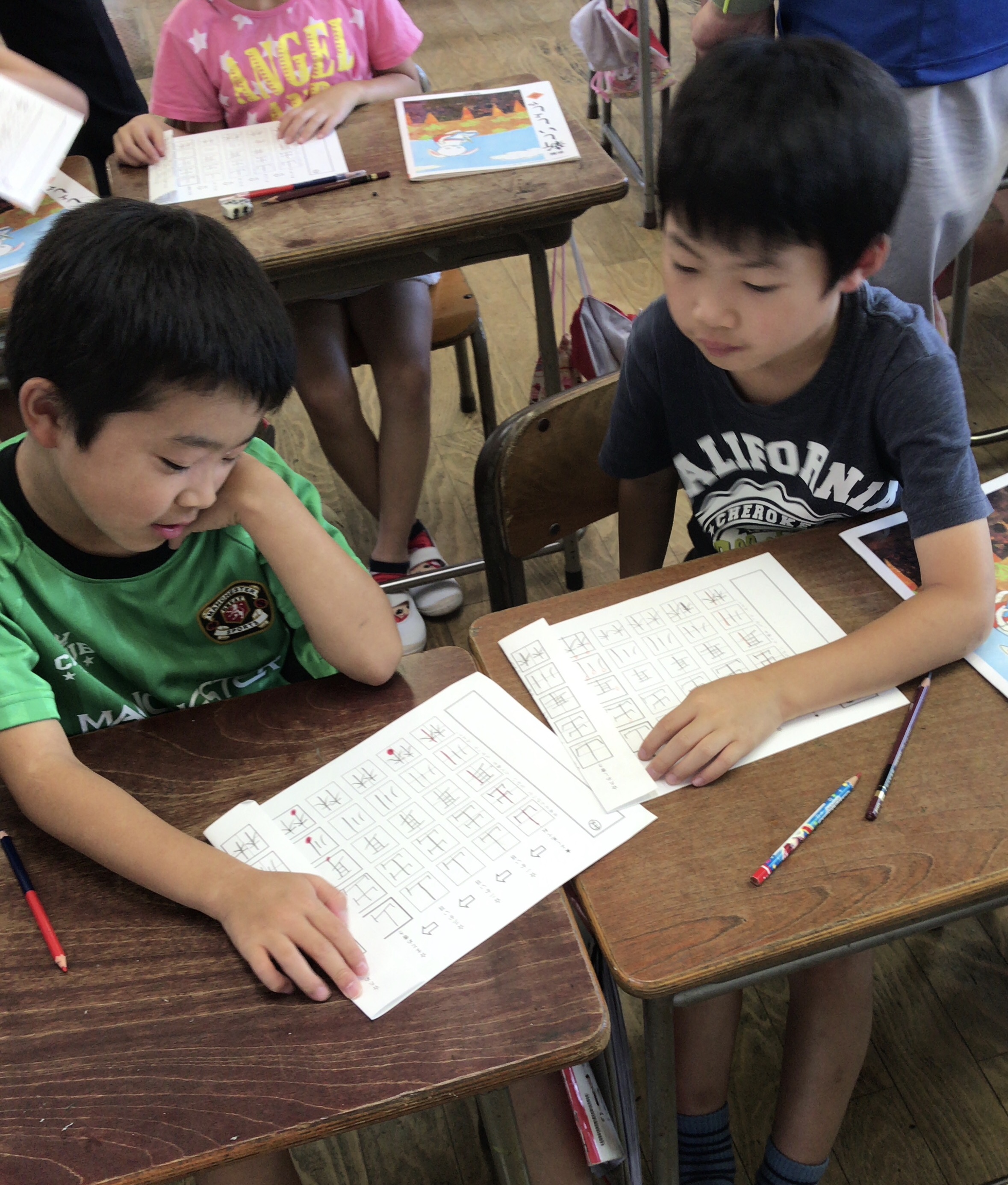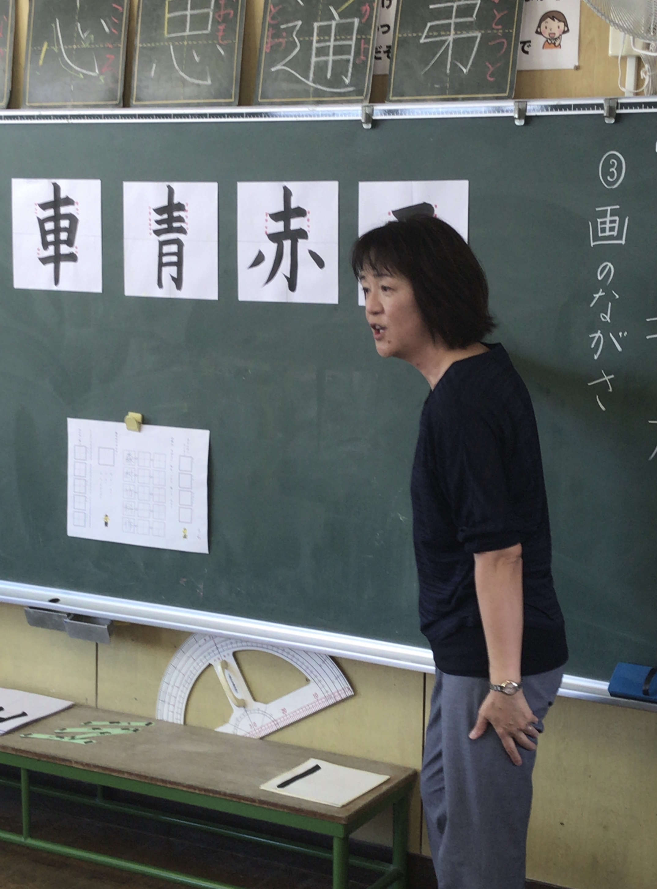 本時のねらい:始筆が接する場合、先に書く画の始筆が、後に書く画の始筆より少し出ることを理解して書くことができる。