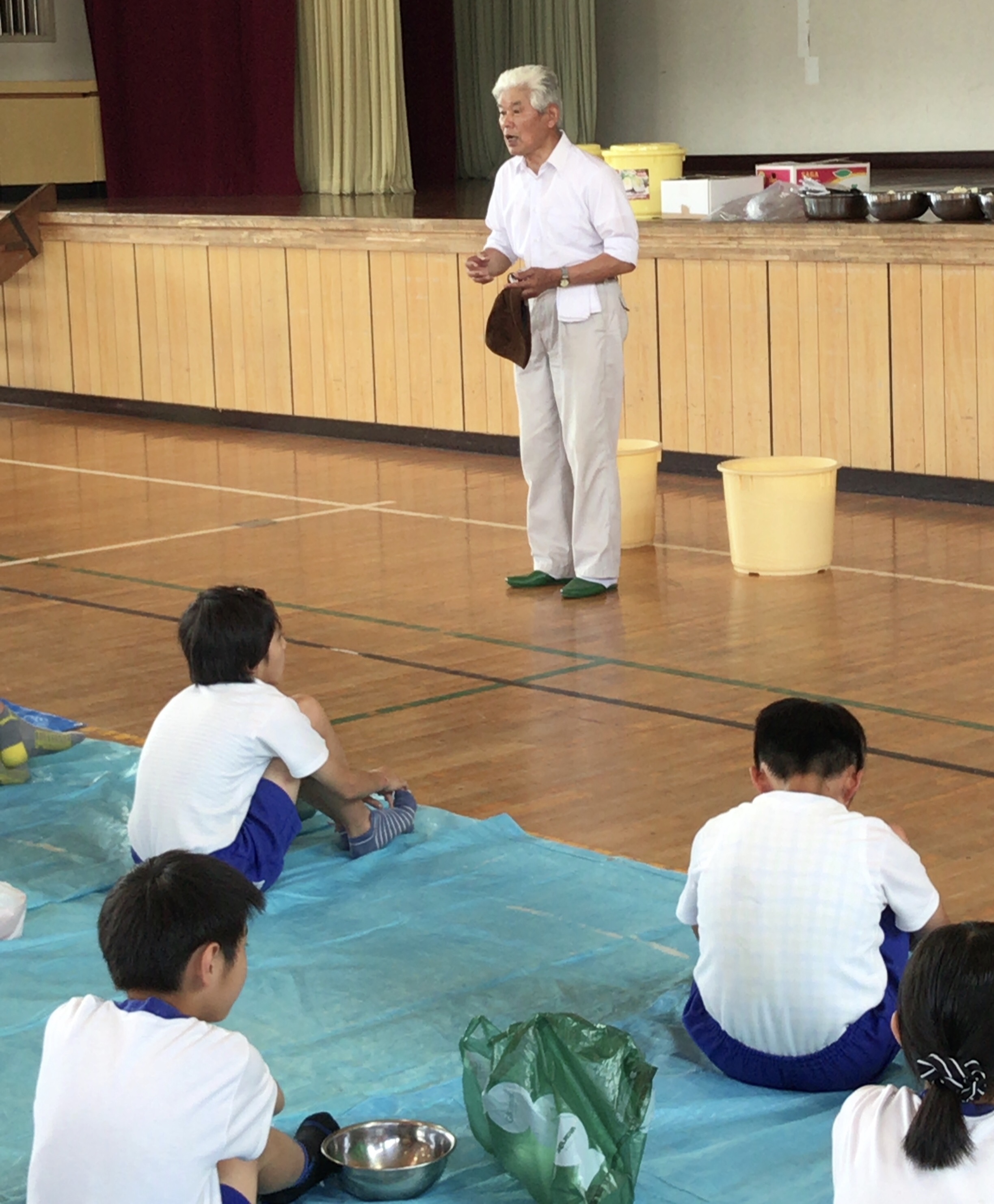 5年生では、毎年、冨田さんから味噌づくりを教えていただいています。