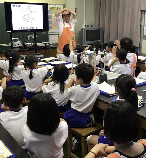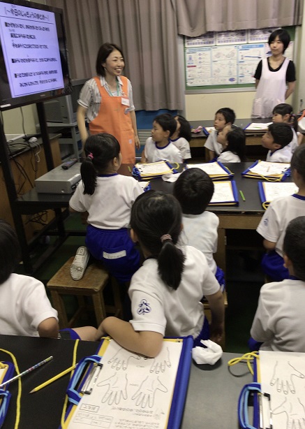 1年生を対象に「手洗い教室」を実施しました。ブラックライトを使って手の汚れを確認し、正しい手の洗い方を学習しました。