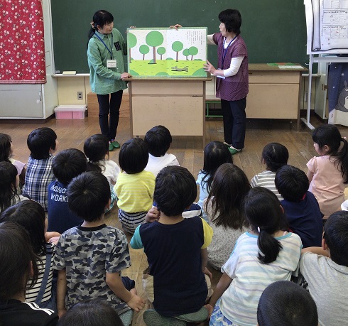 図書ボランティアによる本の「読み聞かせ」がありました。1年生はプレールームで、2年生は図書室で行っていただきました。今年度になって初めてでしたので、ボランティアの方たちも緊張の面持ちでしたが、次第に慣れて、子どもたちも真剣に聞き入っていました。次回は、7月です。子どもたちはとても楽しみにしているようでした。