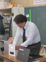 授業のはじめ、担任の先生が箱で回路の一部を隠しながら、ソケットなしで豆電球に明かりをつけて見せます。