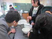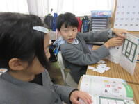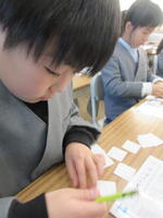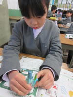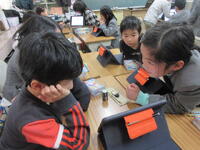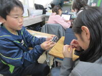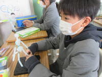 今日1月23日(木)の5校時、2組の子どもたちが、「豆電気のソケットなしで明かりをつけるには、どうしたらいいのか?」という課題に取り組んでいました。