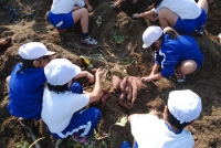 収穫の秋を迎え,学校の畑のいもほりをしました。大きないもが,たくさんできました。畑の5カ所から,いもを掘り,信夫支所で検査を行ったところ,放射線は検出基準以下で大丈夫でした。(2年,わかば・かがやき)
