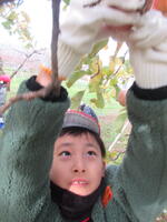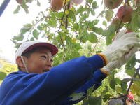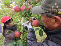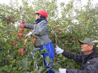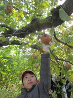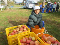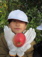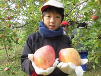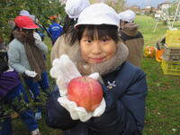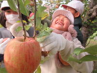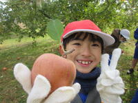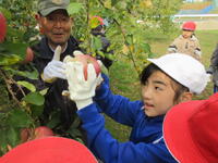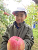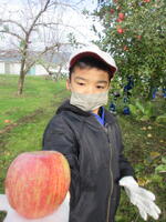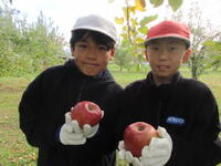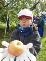 子どもたちは、木にたくさん実った赤いリンゴの軸が取れないよう丁寧にもぎ取り、手際よく次々と収穫していきました。今年は、大豊作です。