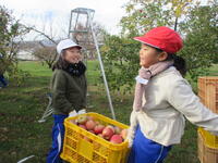 3年生が、今日11月20日(水)の2~3校時の総合的な学習の時間に、「リンゴの先生」の兒玉先生と宍戸先生にお世話になっているリンゴ農園に出かけ、収穫作業を体験しました。