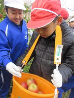 収穫したリンゴのうち、生食用のものは、近日中に自宅へ持ち帰ったり、全校生にプレゼントしたりし、加工用のものは、明後日に予定されているジャムつくりで使用されるとのこと。